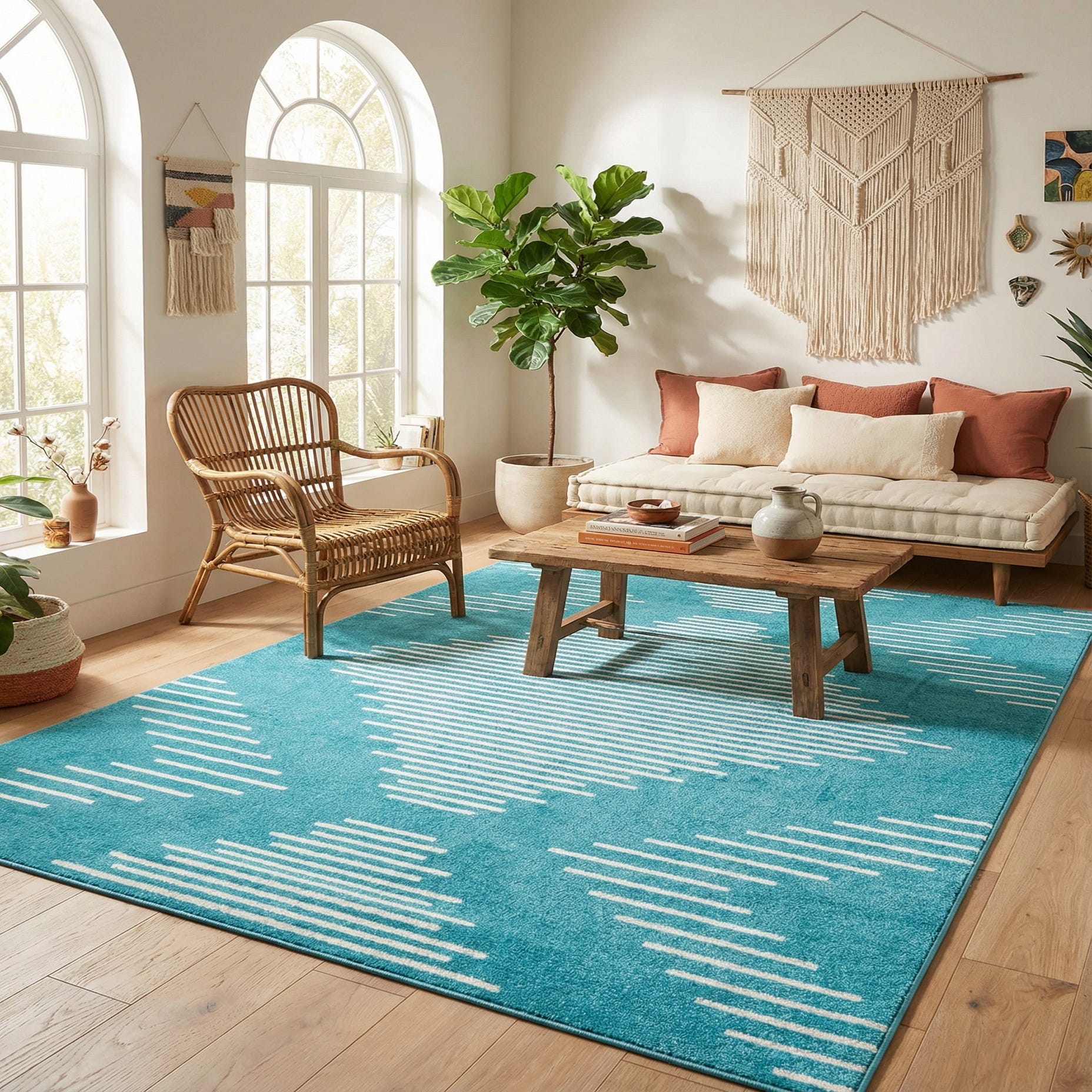 Primary color is Turquoise. Colors in this rug include: Turquoise, Ivory.