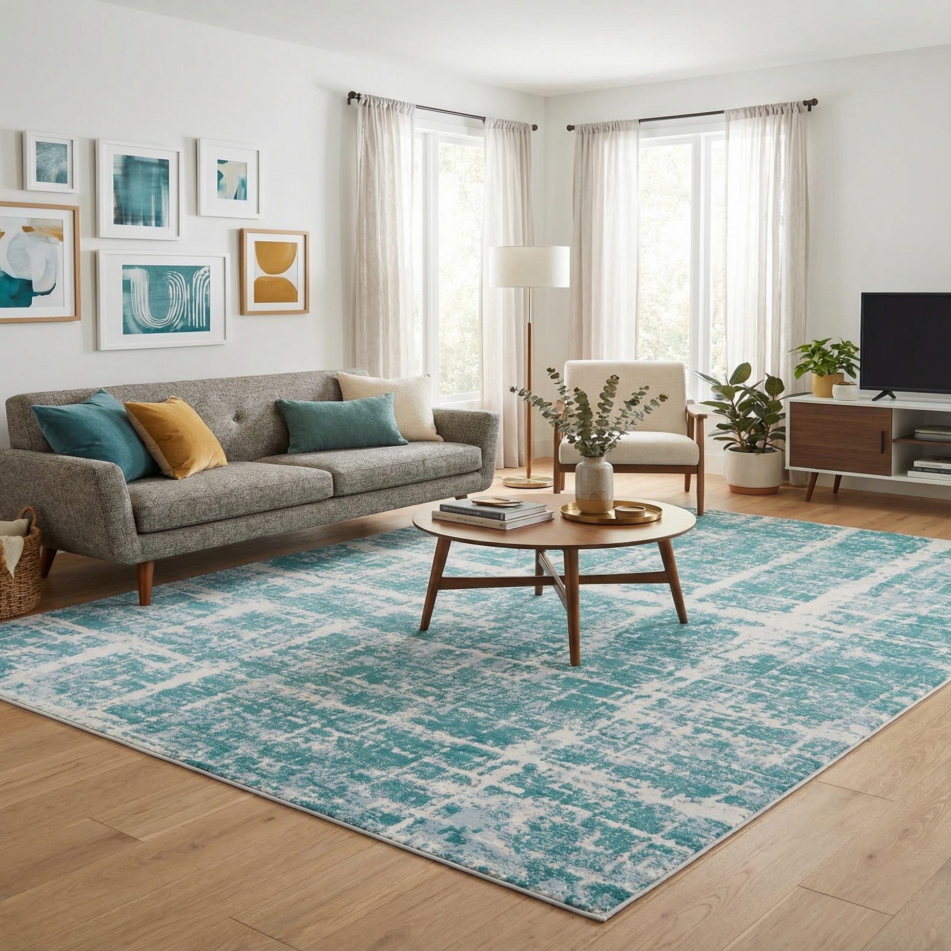 Primary color is Turquoise. Colors in this rug include: Turquoise, Ivory, Light Blue.
