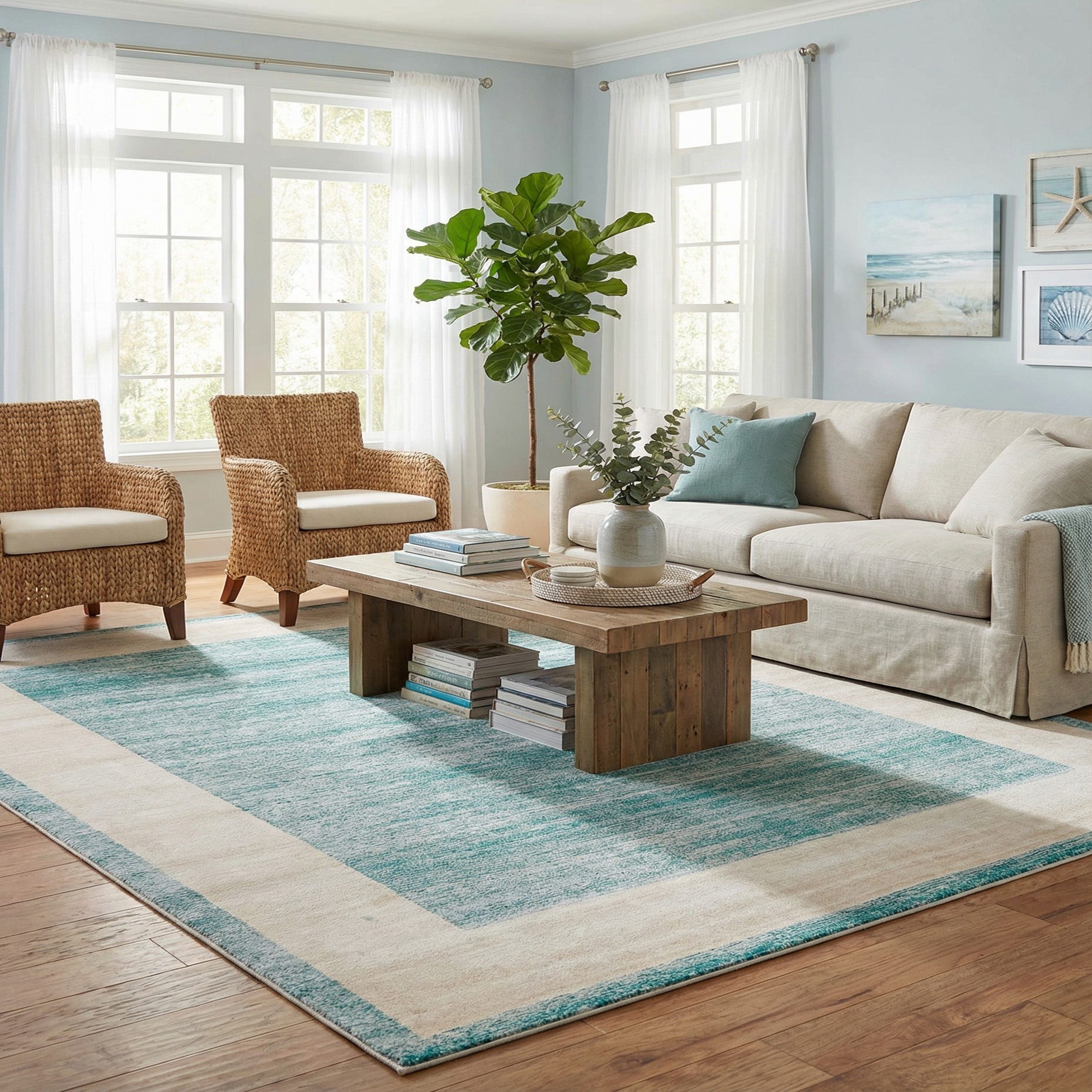 Primary color is Turquoise. Colors in this rug include: Turquoise, Ivory.