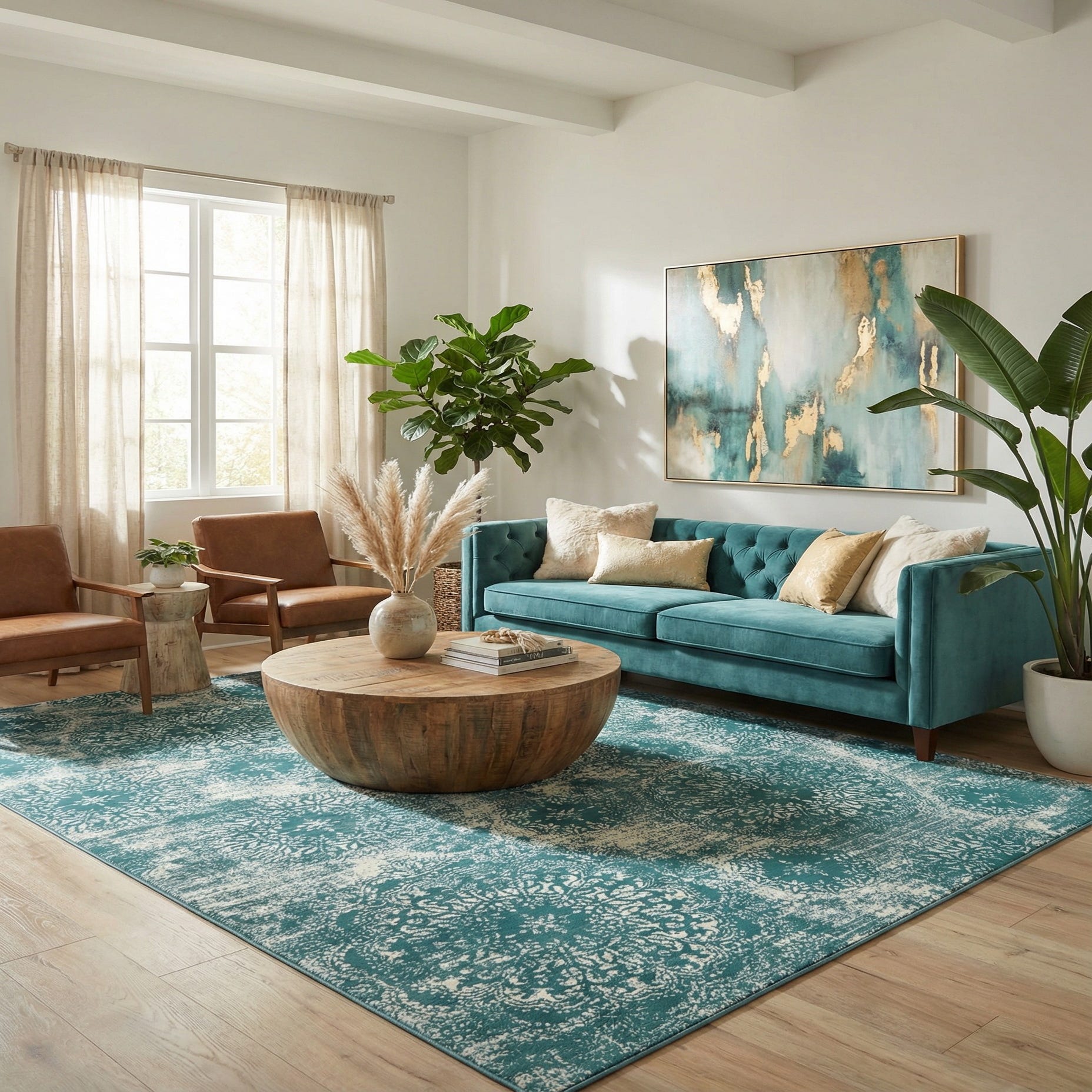 Primary color is Turquoise. Colors in this rug include: Turquoise, Ivory.