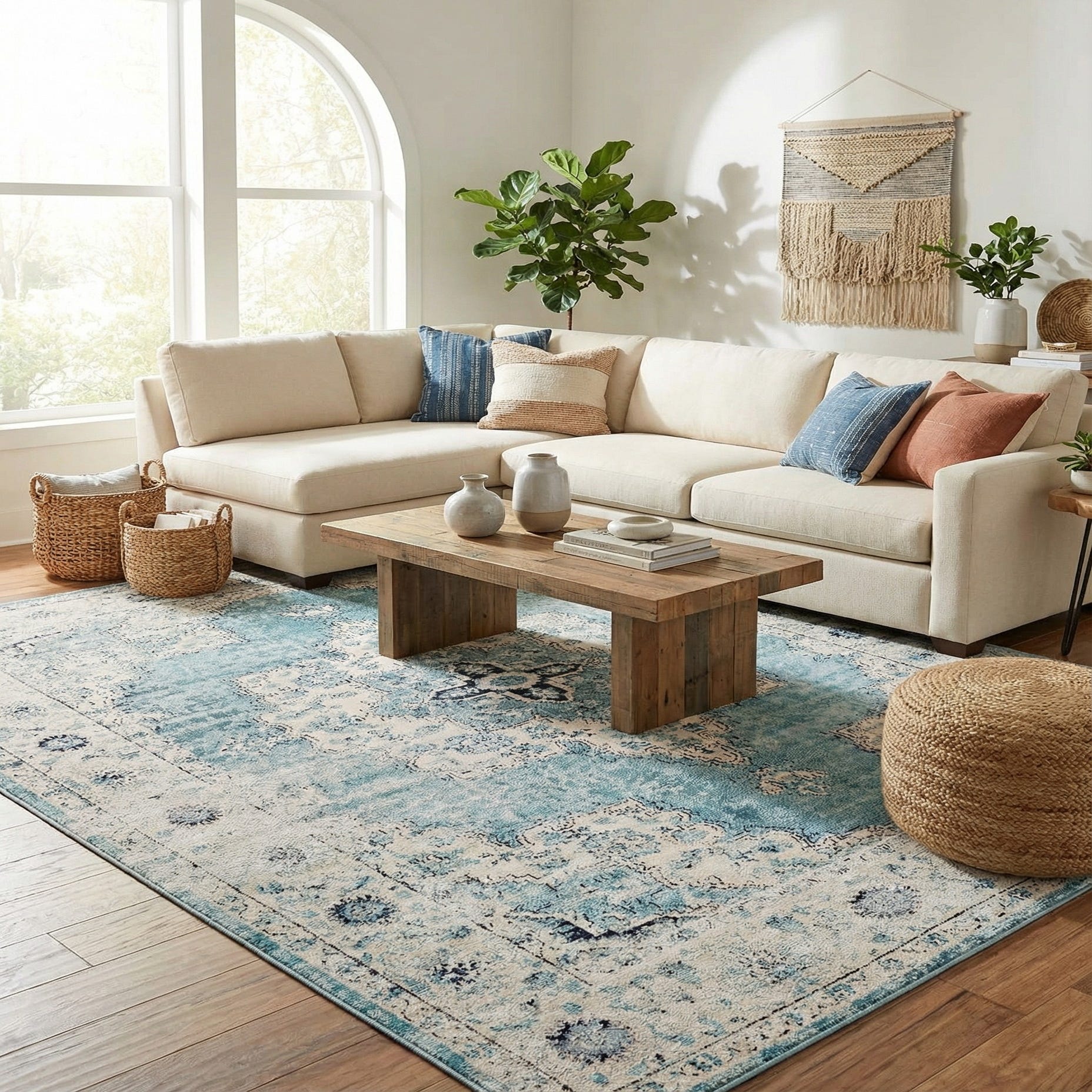 Primary color is Turquoise. Colors in this rug include: Turquoise, Cream, Teal, Navy Blue, Beige.