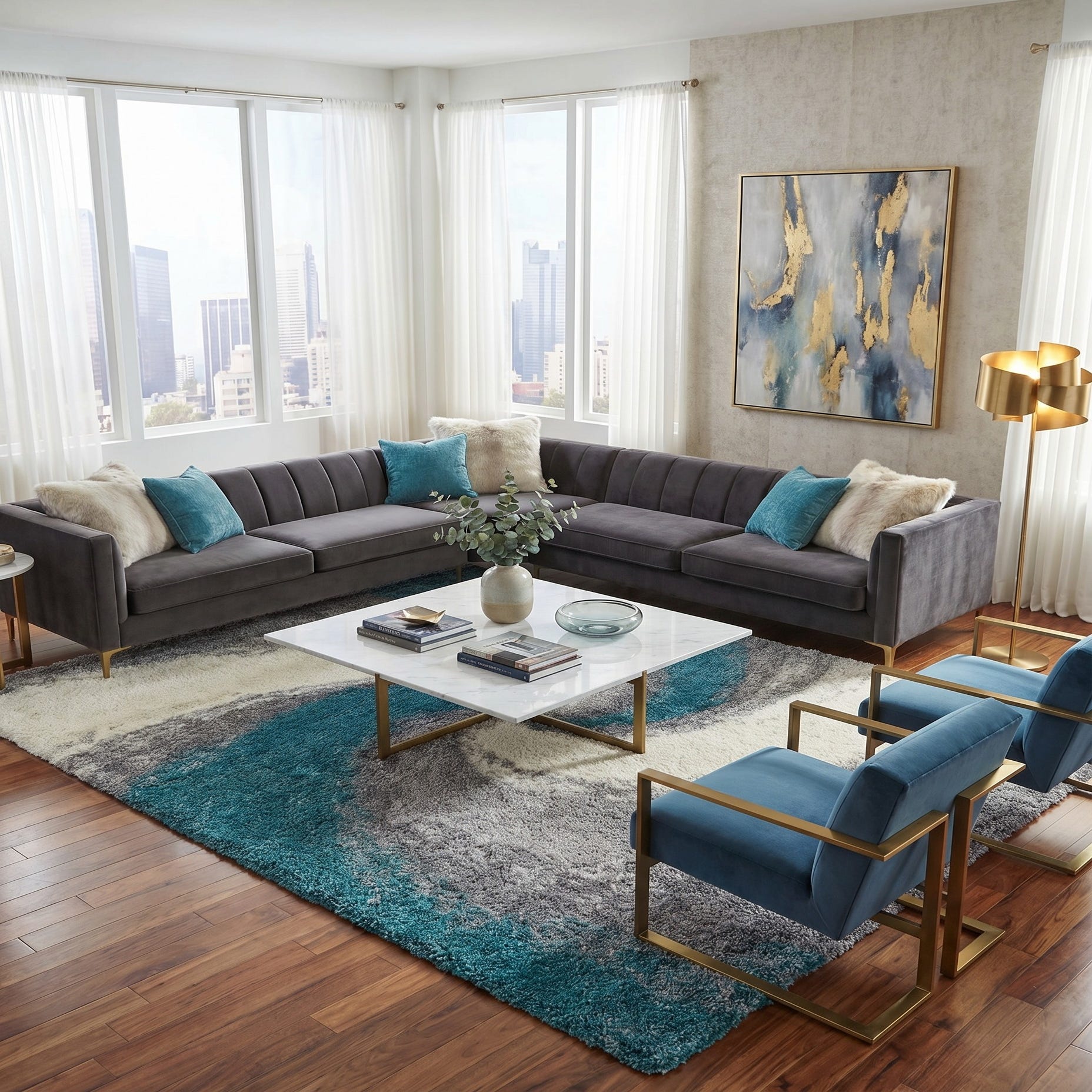 Bought this rug in the largest size for my living room. The turquoise works great with my decor and really tied all the areas together. Nice feeling shag color is not as bright as it appeared.
