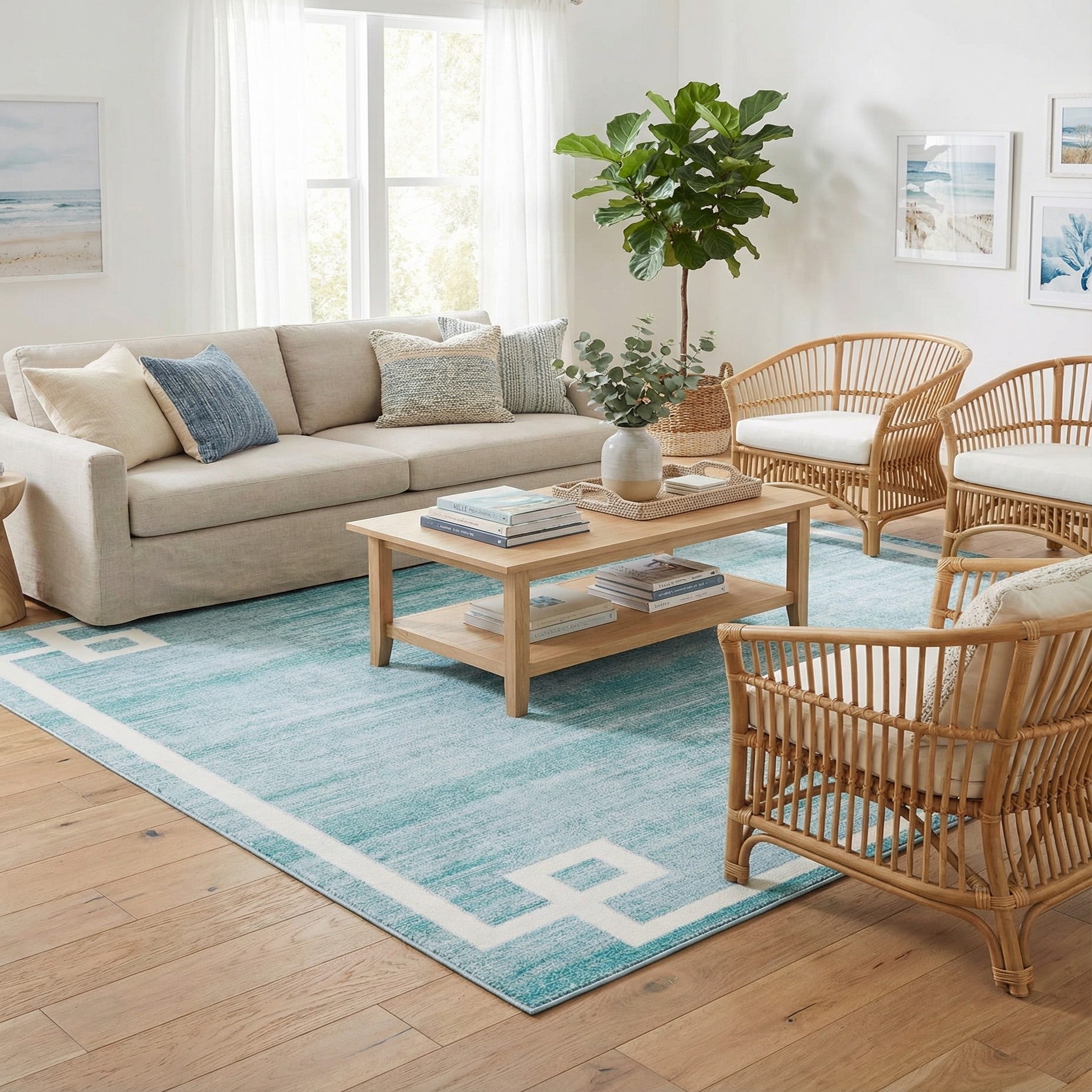 Primary color is Turquoise. Colors in this rug include: Turquoise, Ivory, Light Blue.
