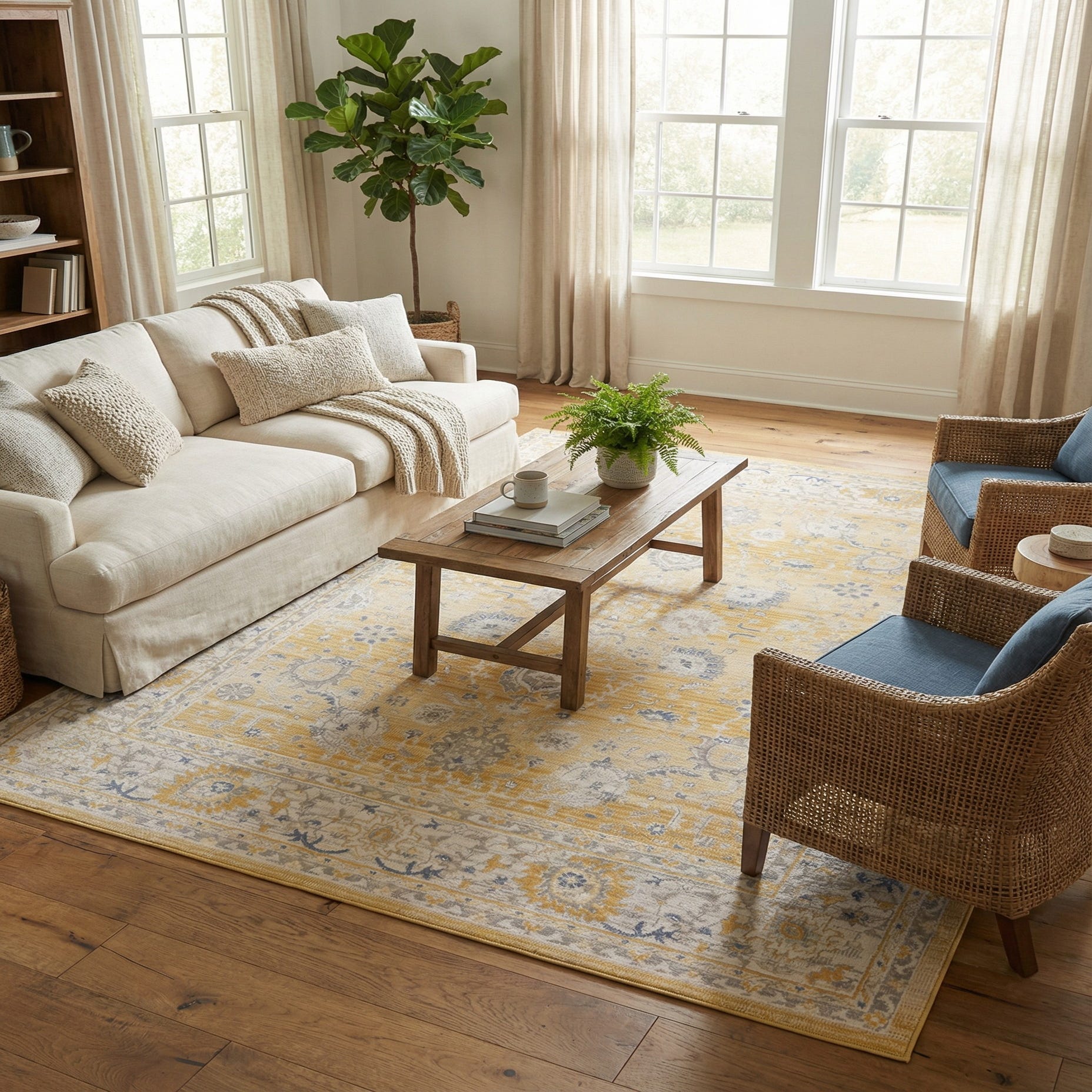 Primary color is Tuscan Yellow. Colors in this rug include: Tuscan Yellow, Blue, Ivory, Gray.