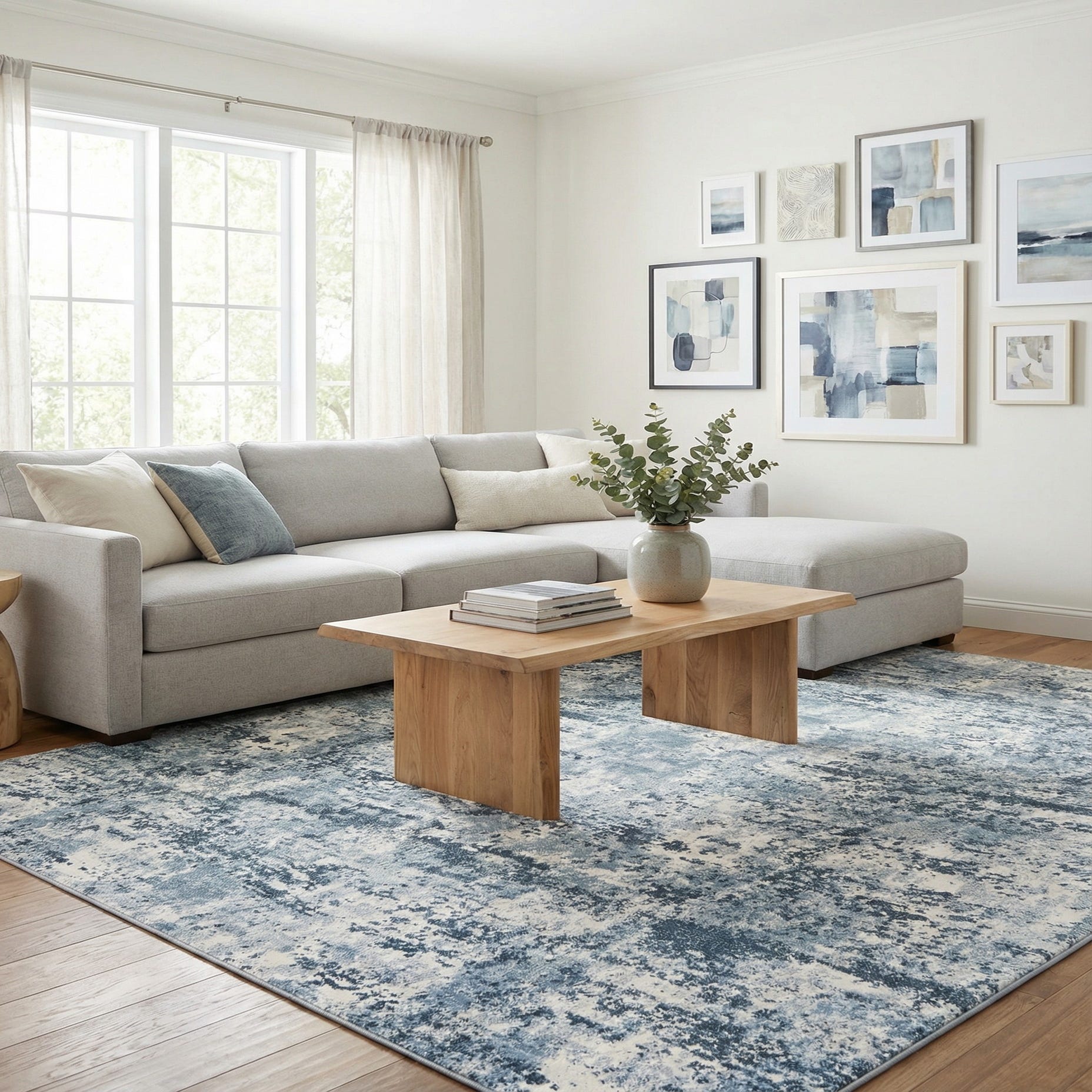 Primary color is Vintage Blue. Colors in this rug include: Vintage Blue, Gray, Ivory.