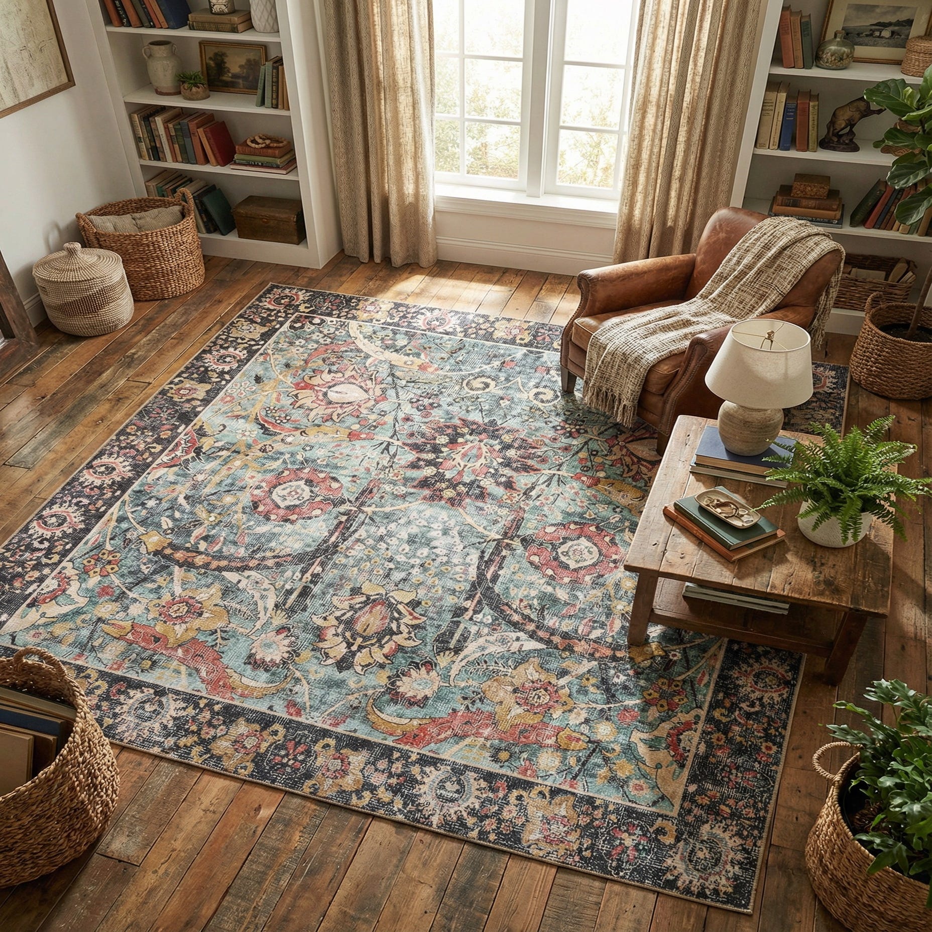 Primary color is Vintage Green. Colors in this rug include: Vintage Green, Beige, Black, Olive, Red, Ivory.