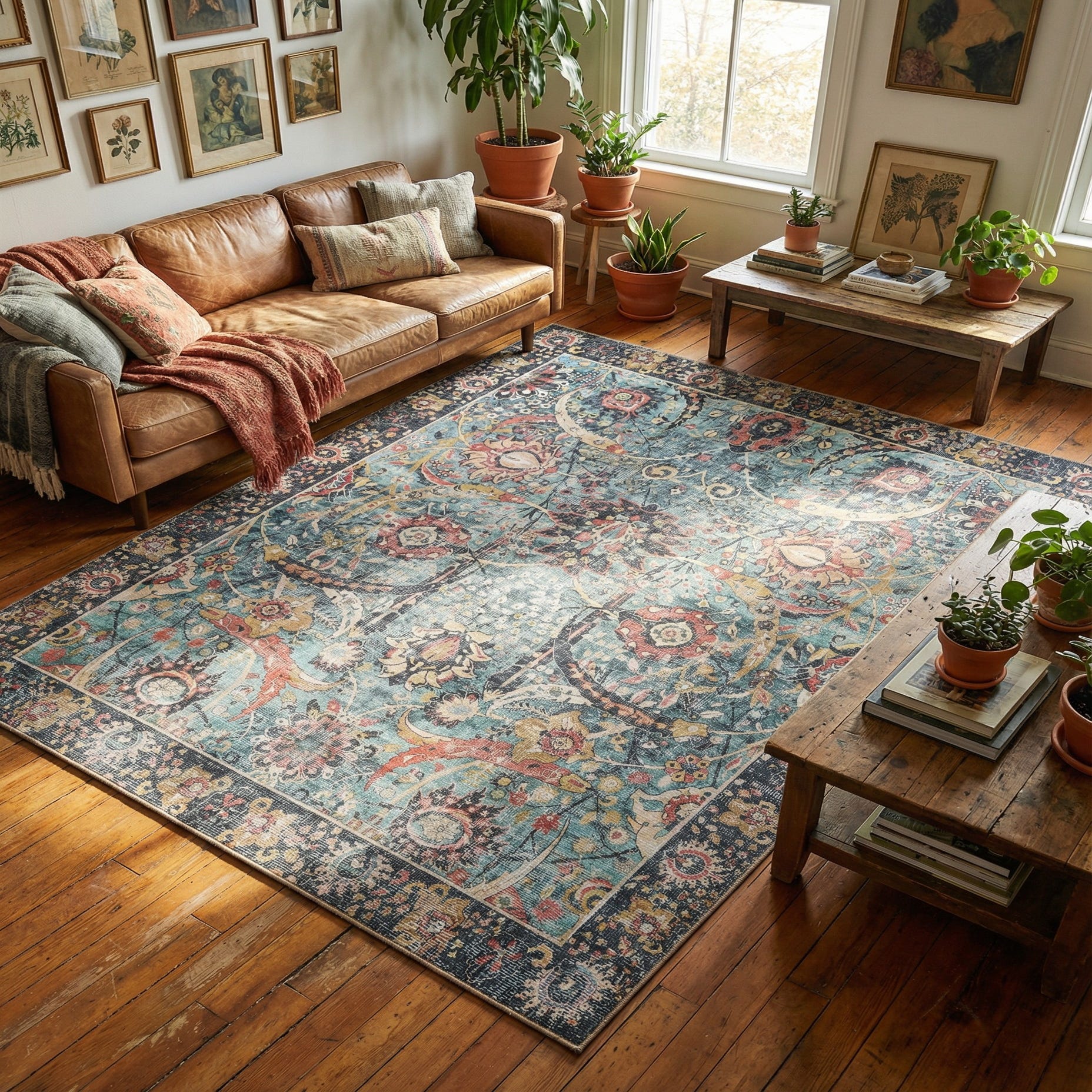 Primary color is Vintage Green. Colors in this rug include: Vintage Green, Beige, Black, Olive, Red, Ivory.