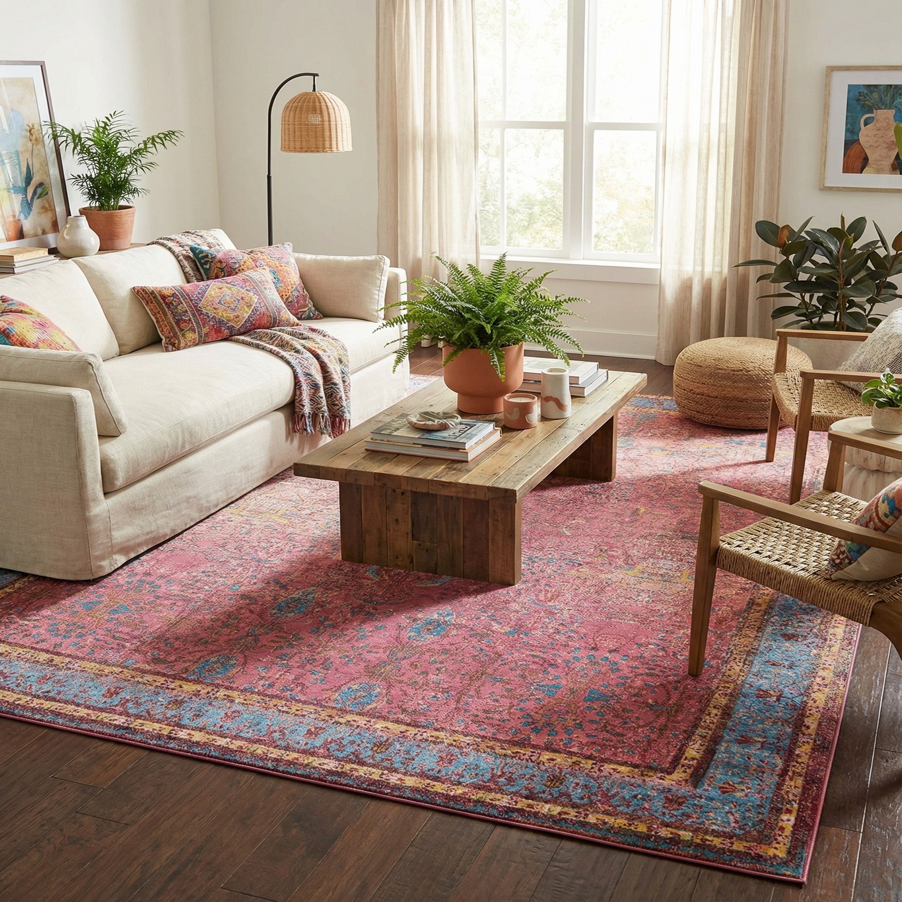 Primary color is Vintage Salmon Coral. Colors in this rug include: Vintage Salmon Coral, Beige, Blue, Brown, Yellow.