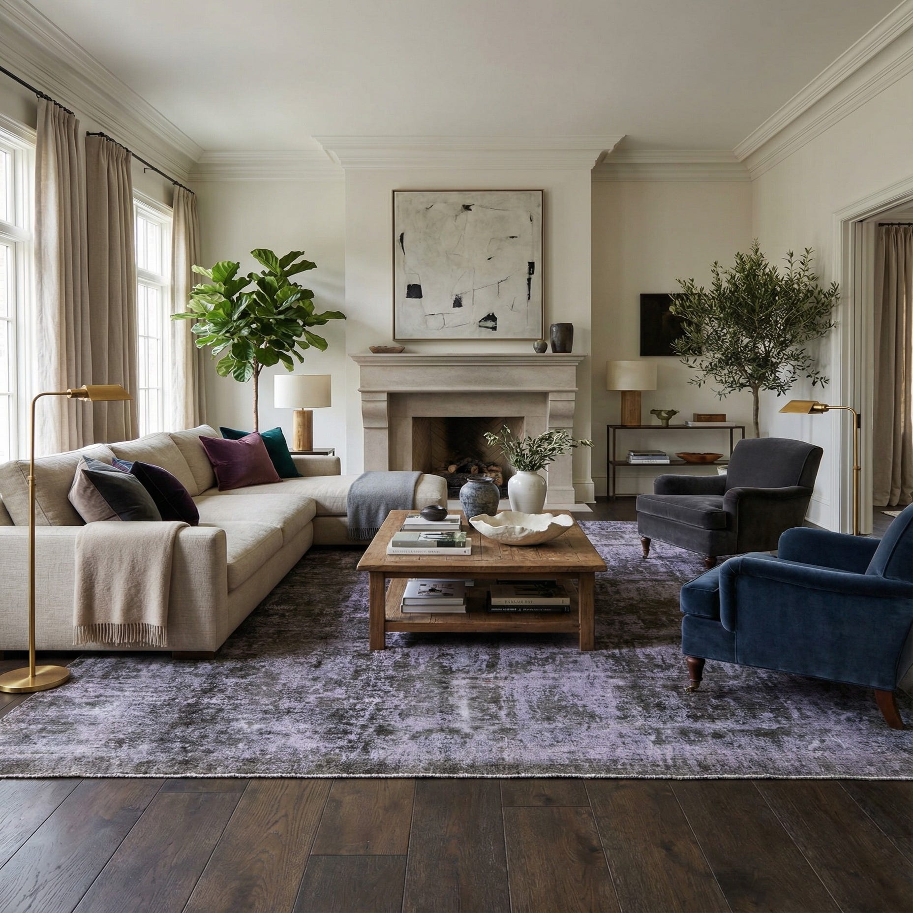 Primary color is Violet. Colors in this rug include: Violet, Black, Ivory, Brown.