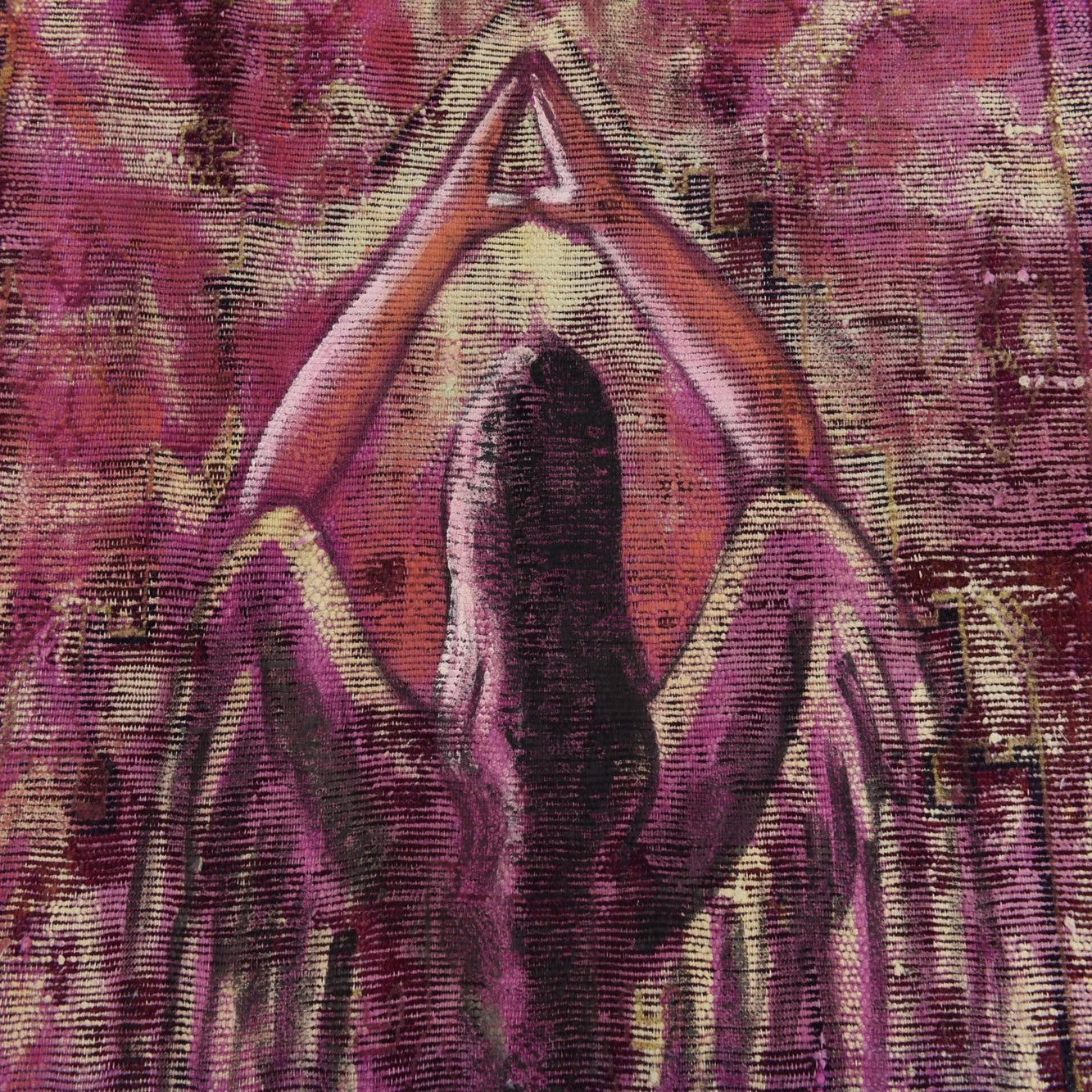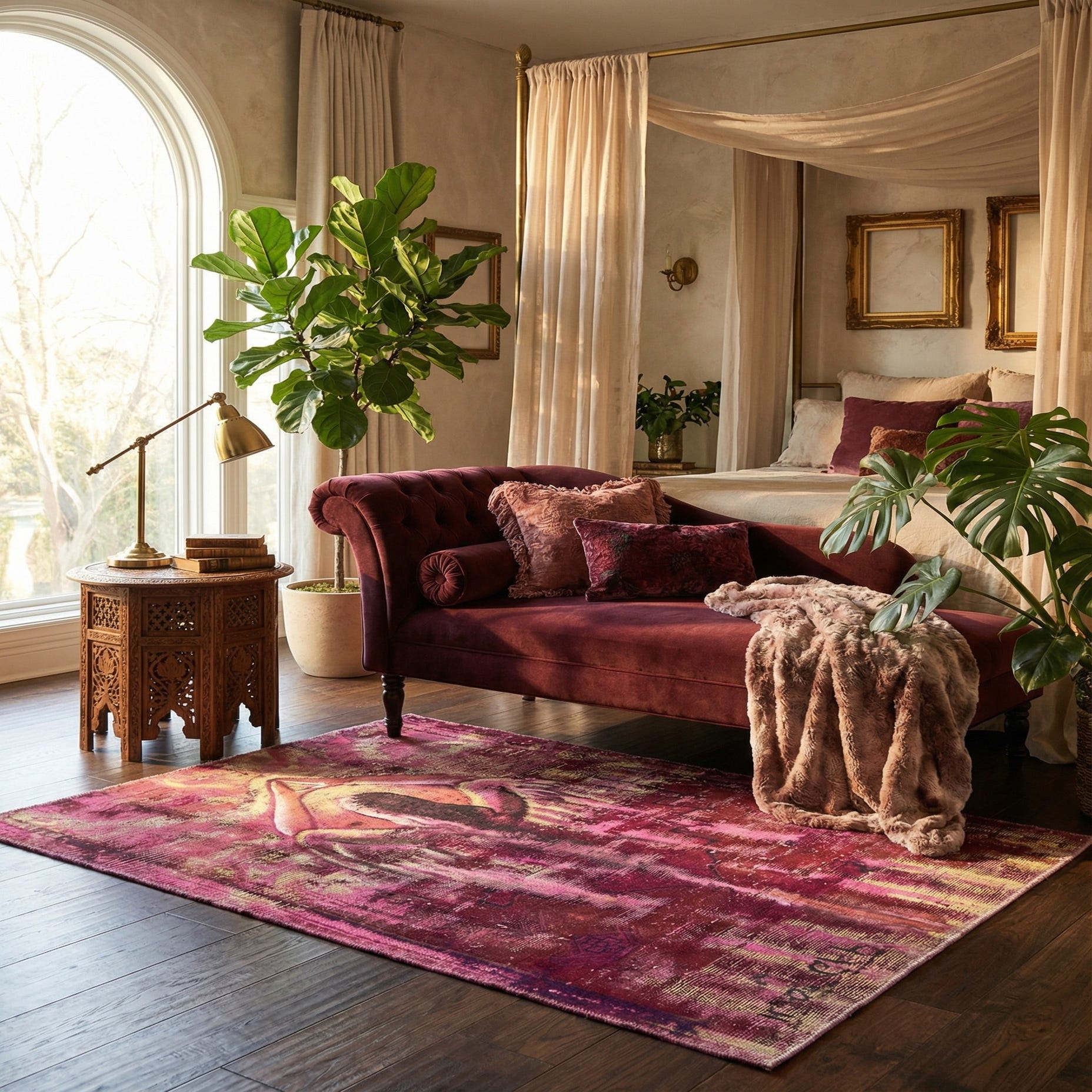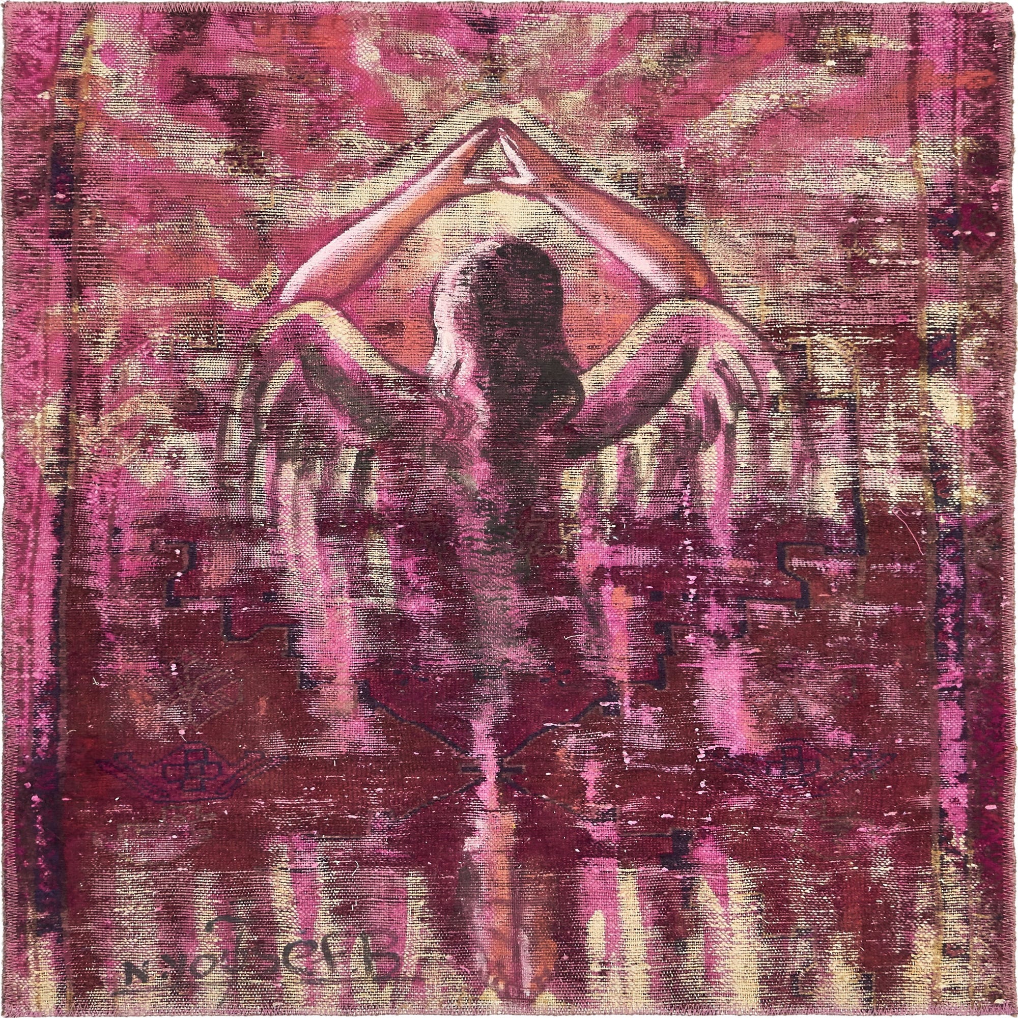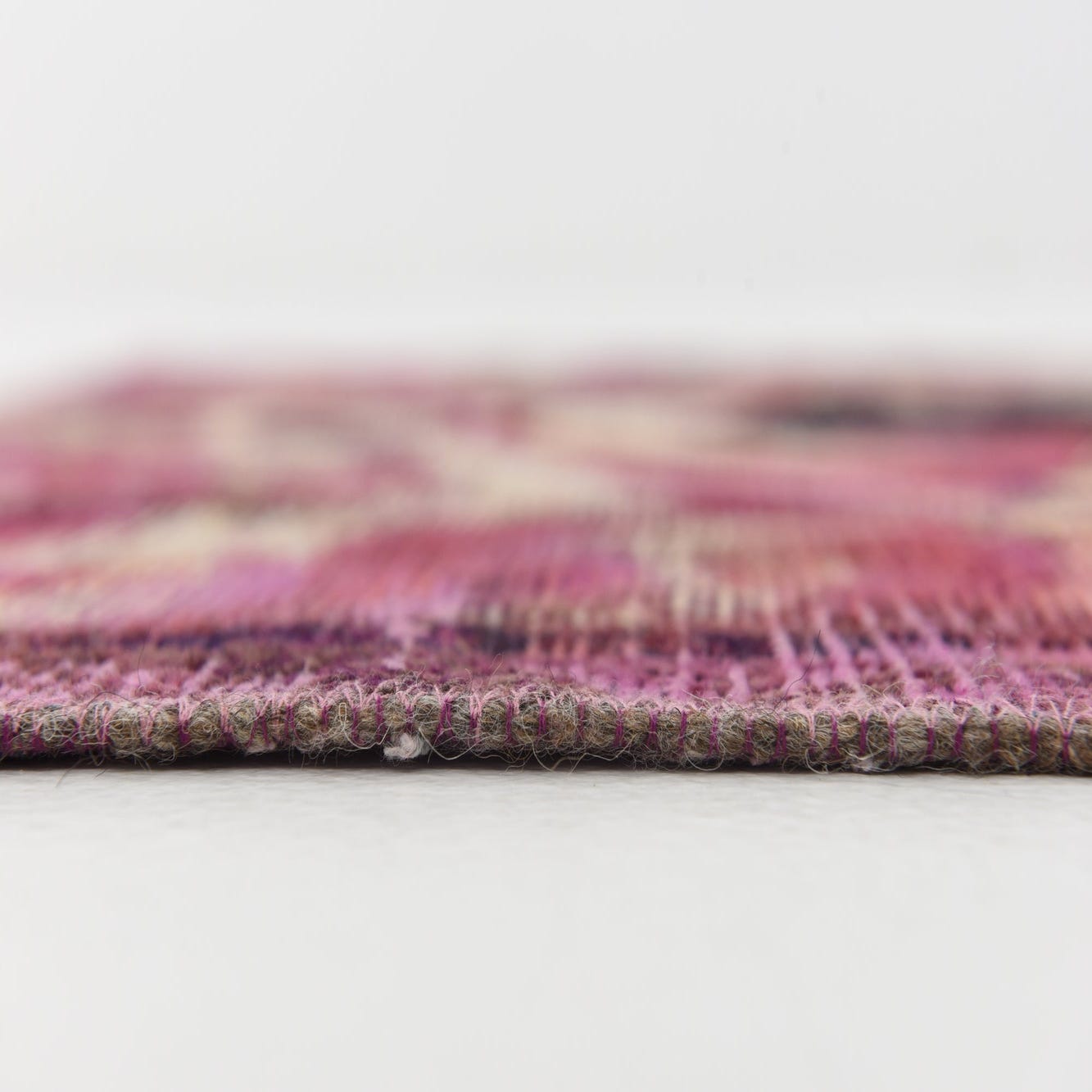 Primary color is Violet. Colors in this rug include: Violet, Gray, Pink, Orange, Burgundy, Beige, Black.