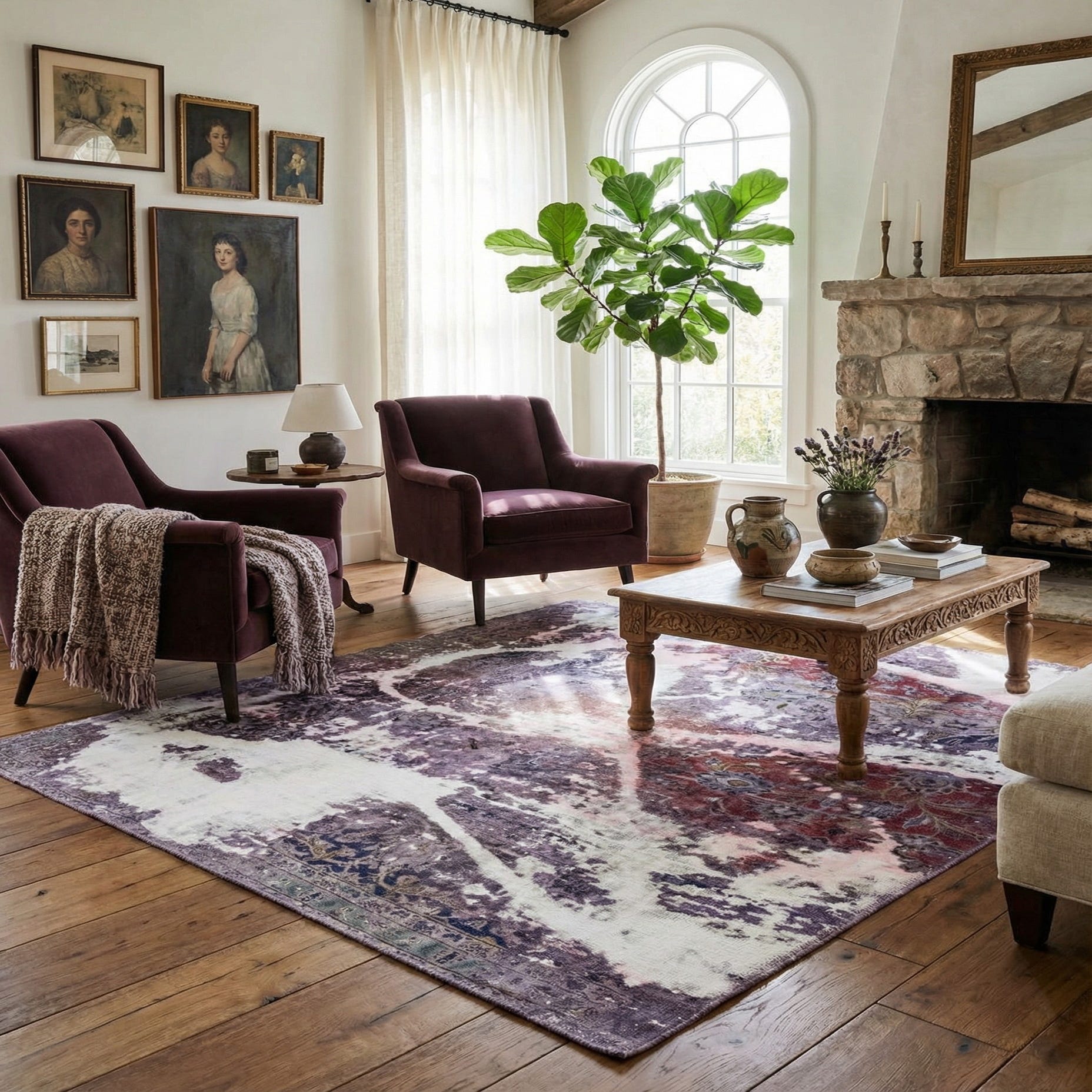 • Deep plum upholstered armchair