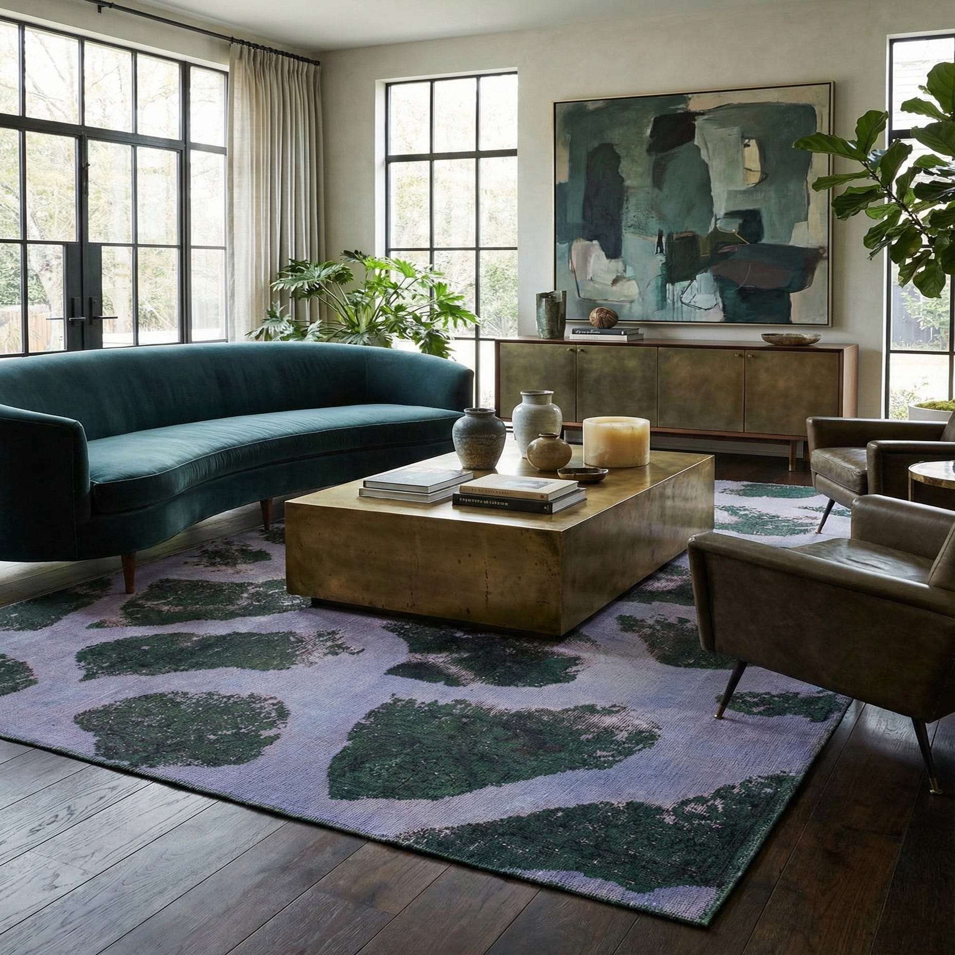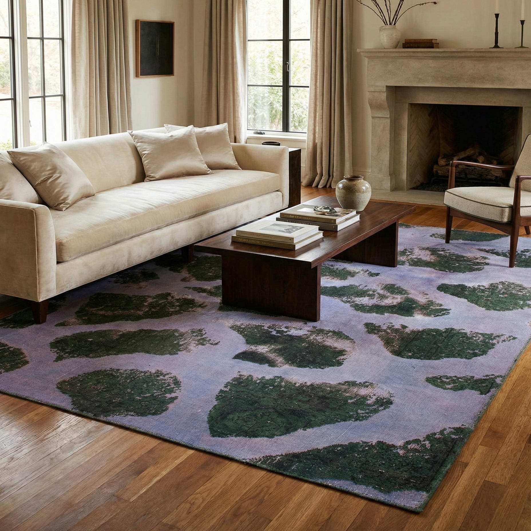 Primary color is Violet. Colors in this rug include: Violet, Green, Navy Blue, Olive.