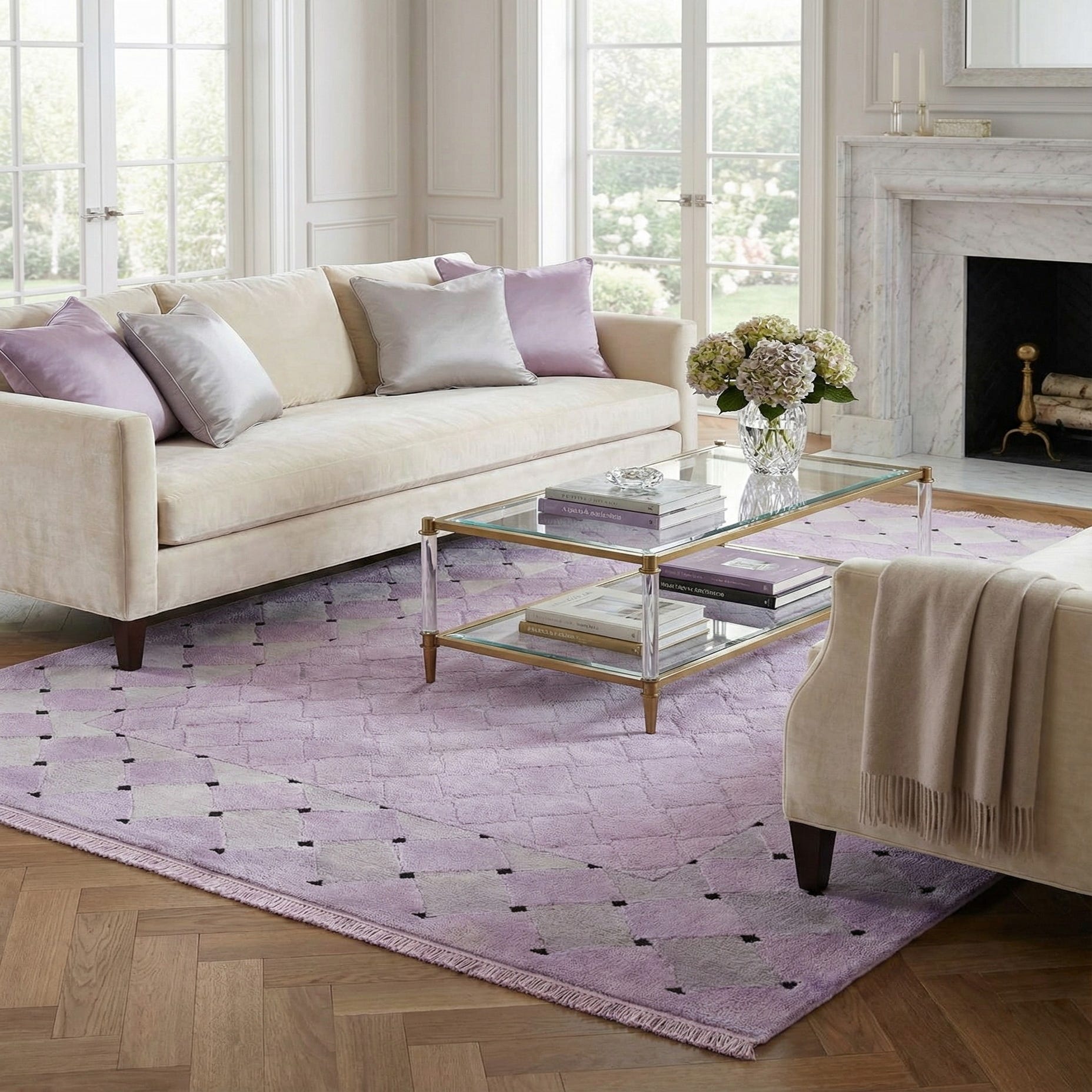 Primary color is Violet. Colors in this rug include: Violet, Gray, Black, Silver.