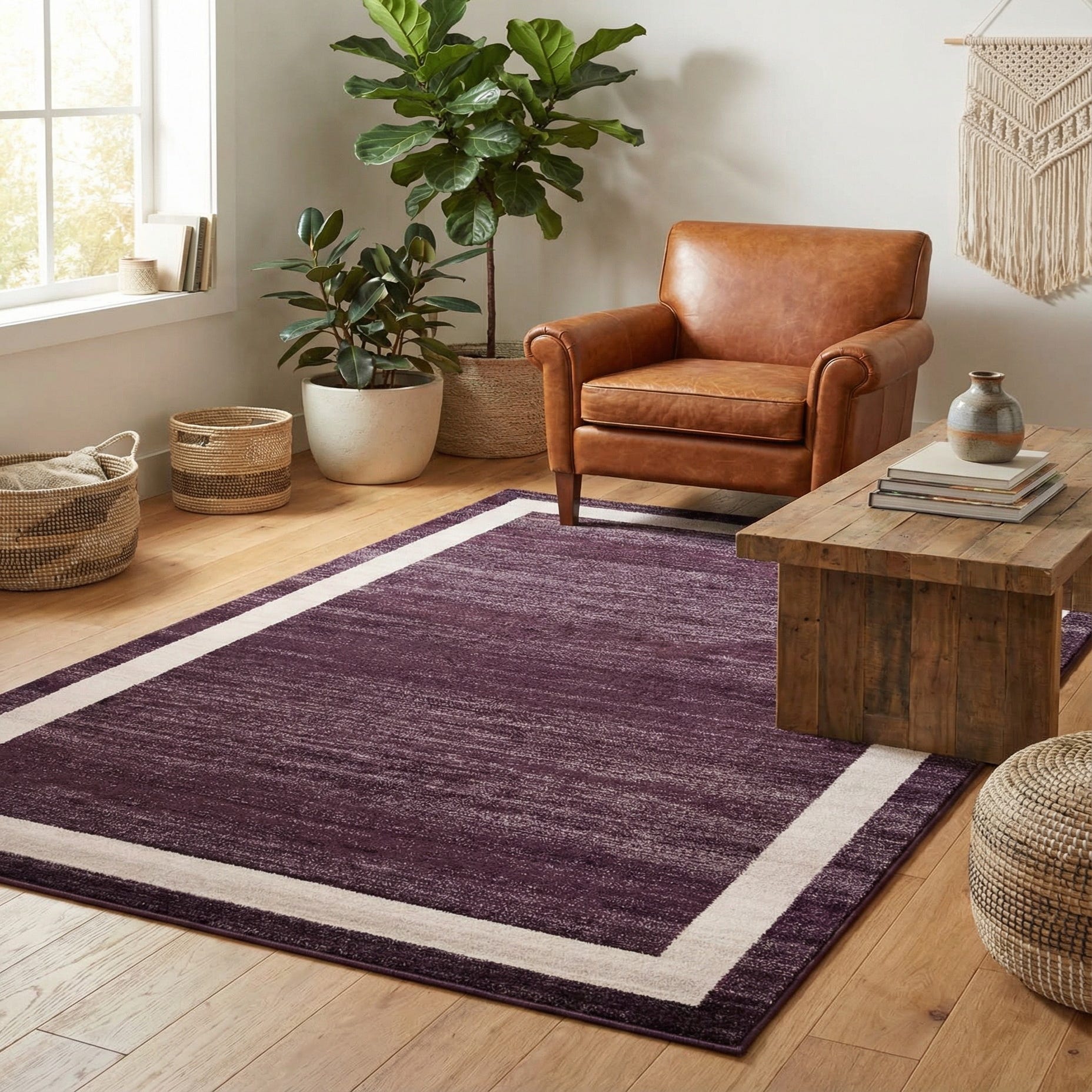 Primary color is Violet. Colors in this rug include: Violet, Ivory.