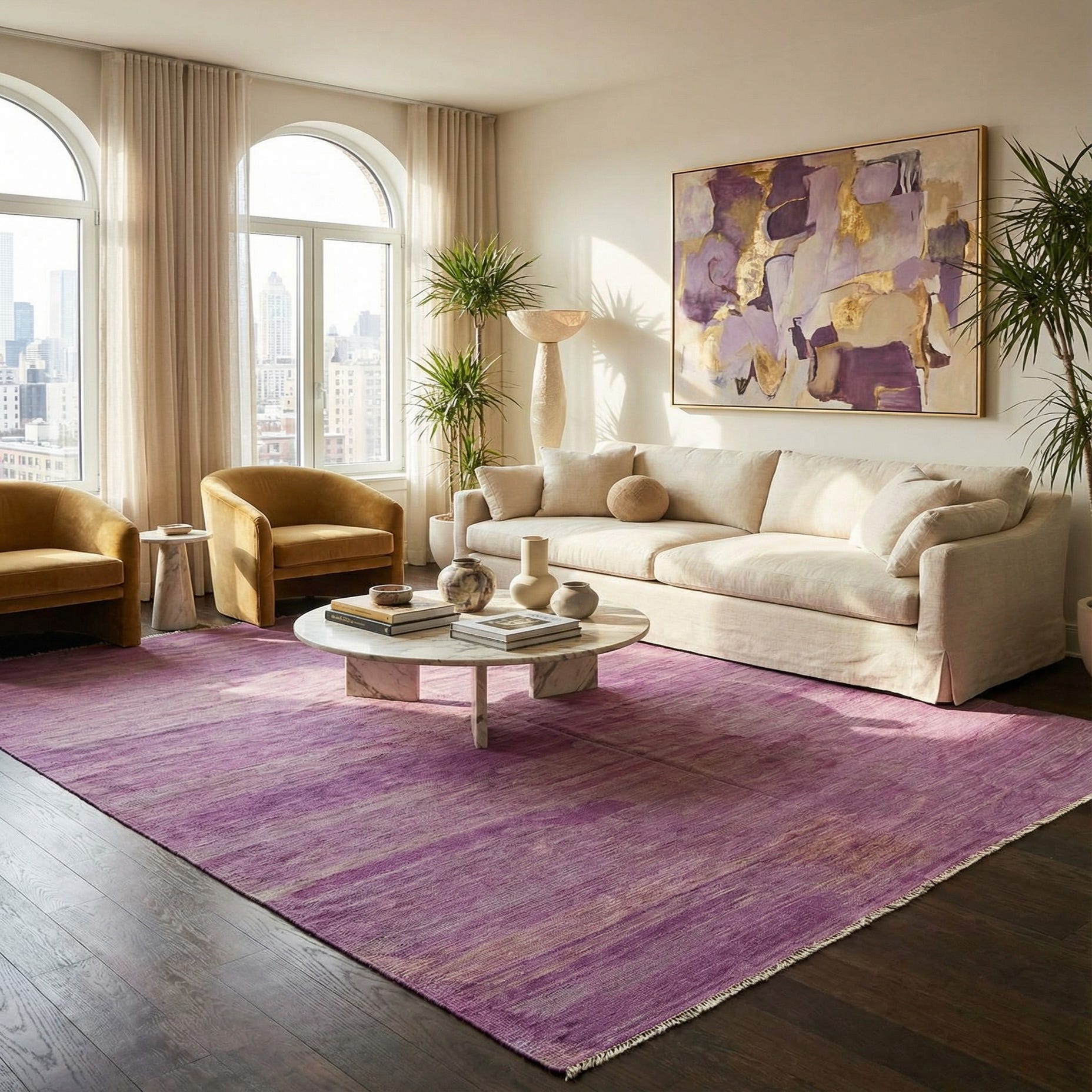 Primary color is Violet. Colors in this rug include: Violet, Beige.