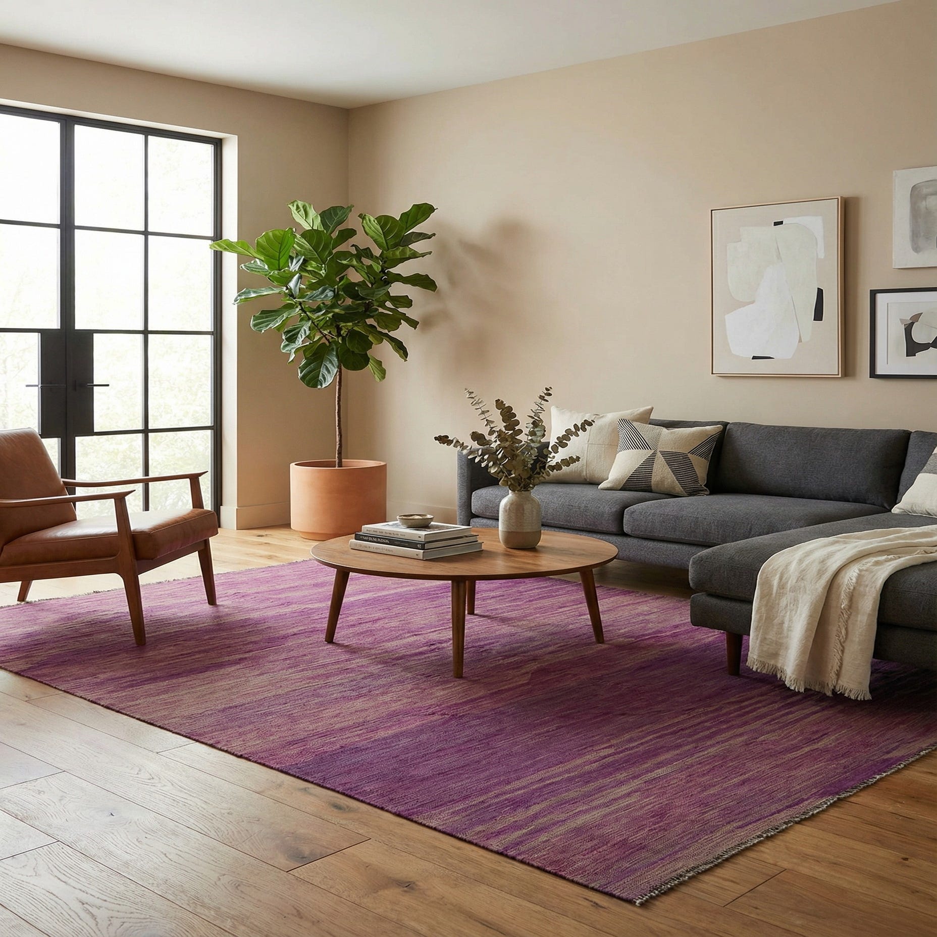 Primary color is Violet. Colors in this rug include: Violet, Beige.