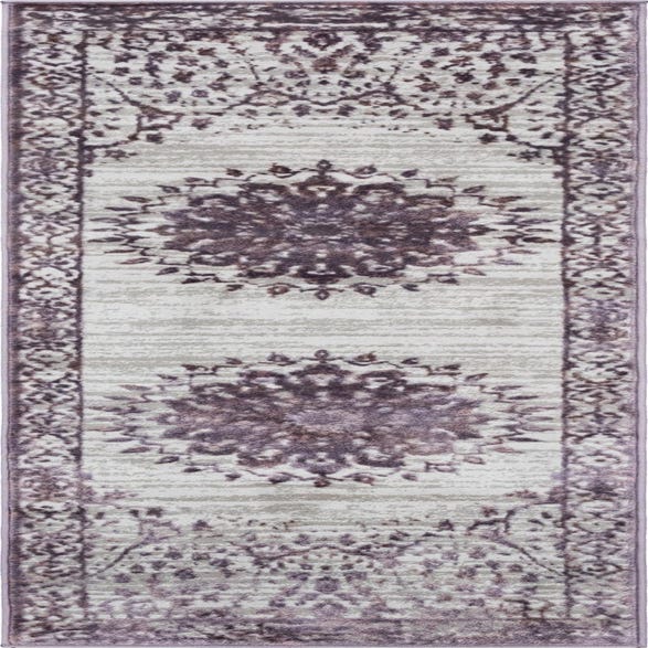 Primary color is Violet. Colors in this rug include: Violet, Beige, Ivory.