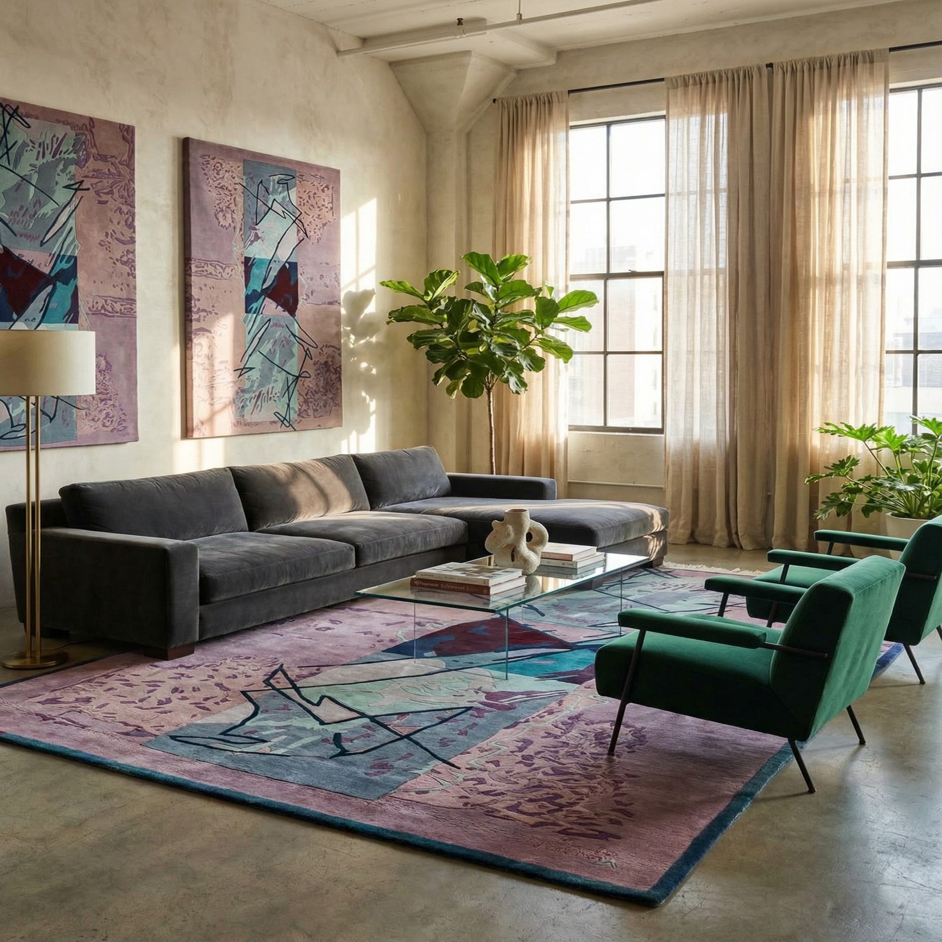 Primary color is Violet. Colors in this rug include: Violet, Beige, Blue, Gray, Green, Burgundy, Purple, Puce.