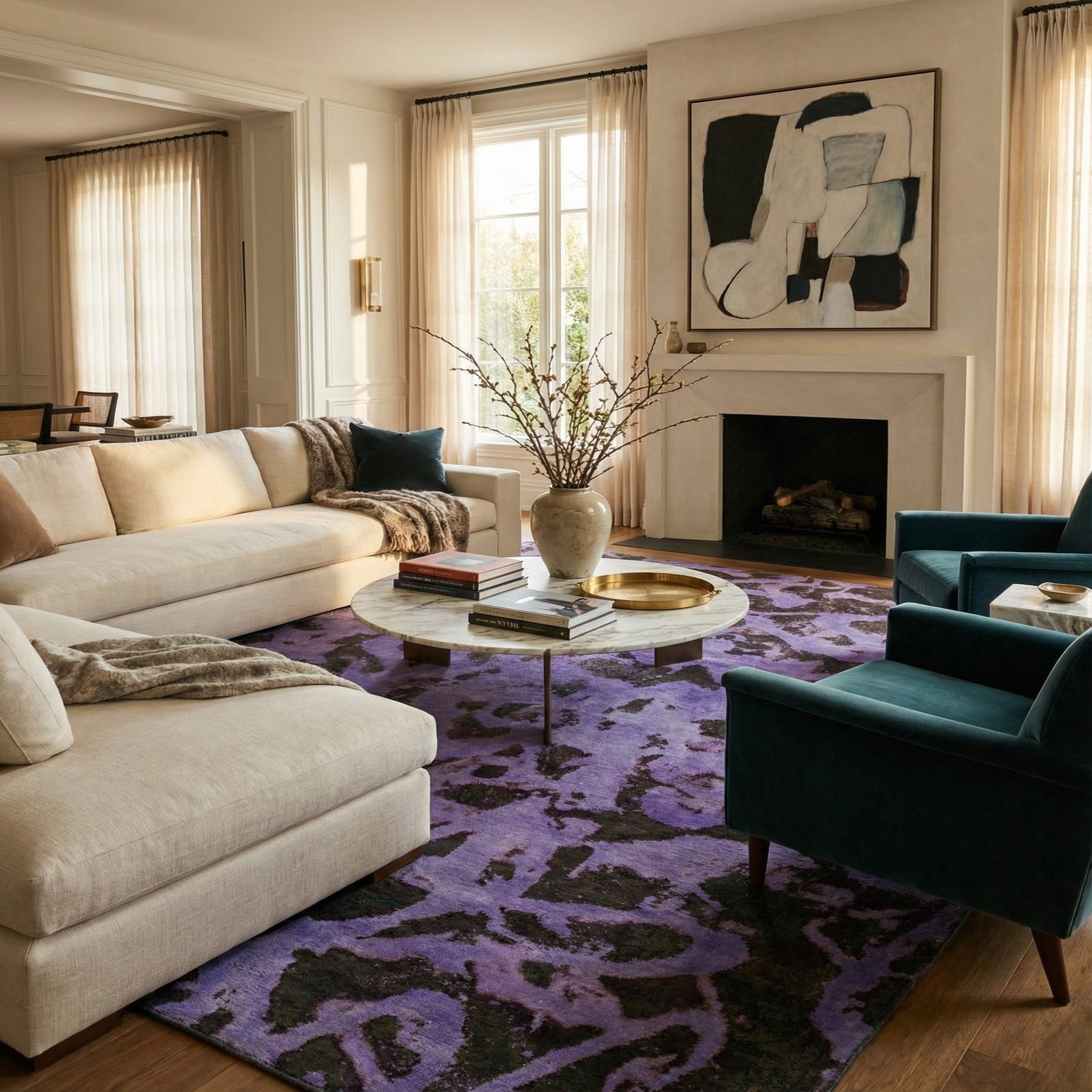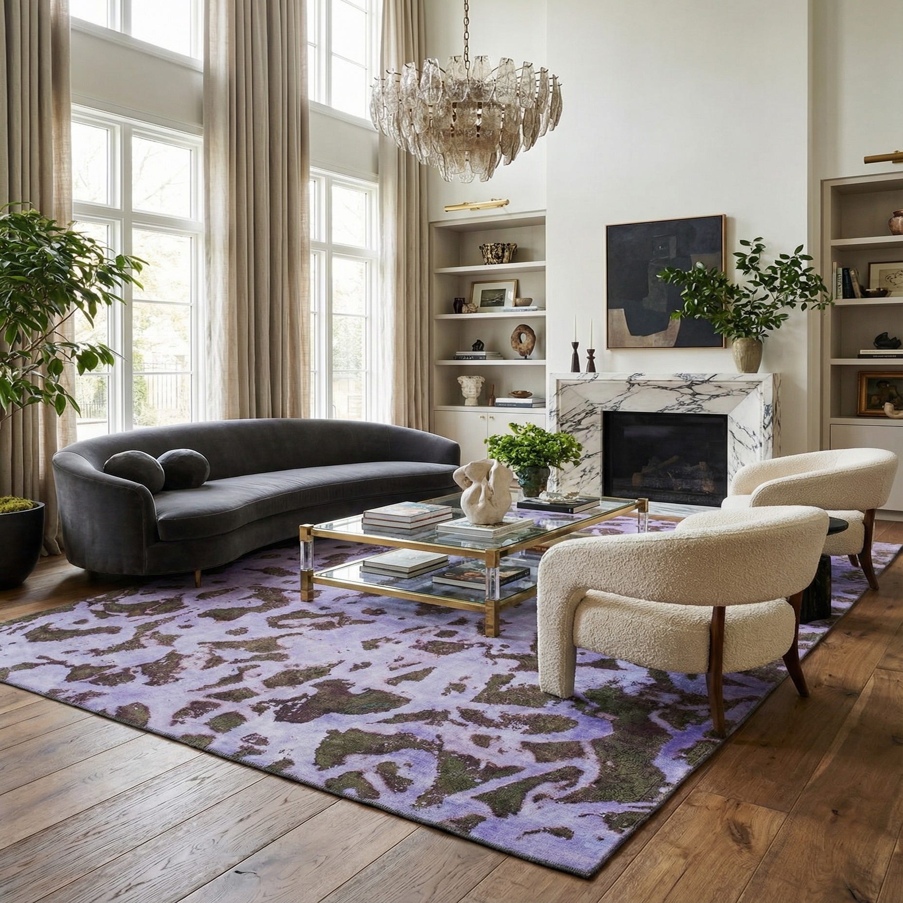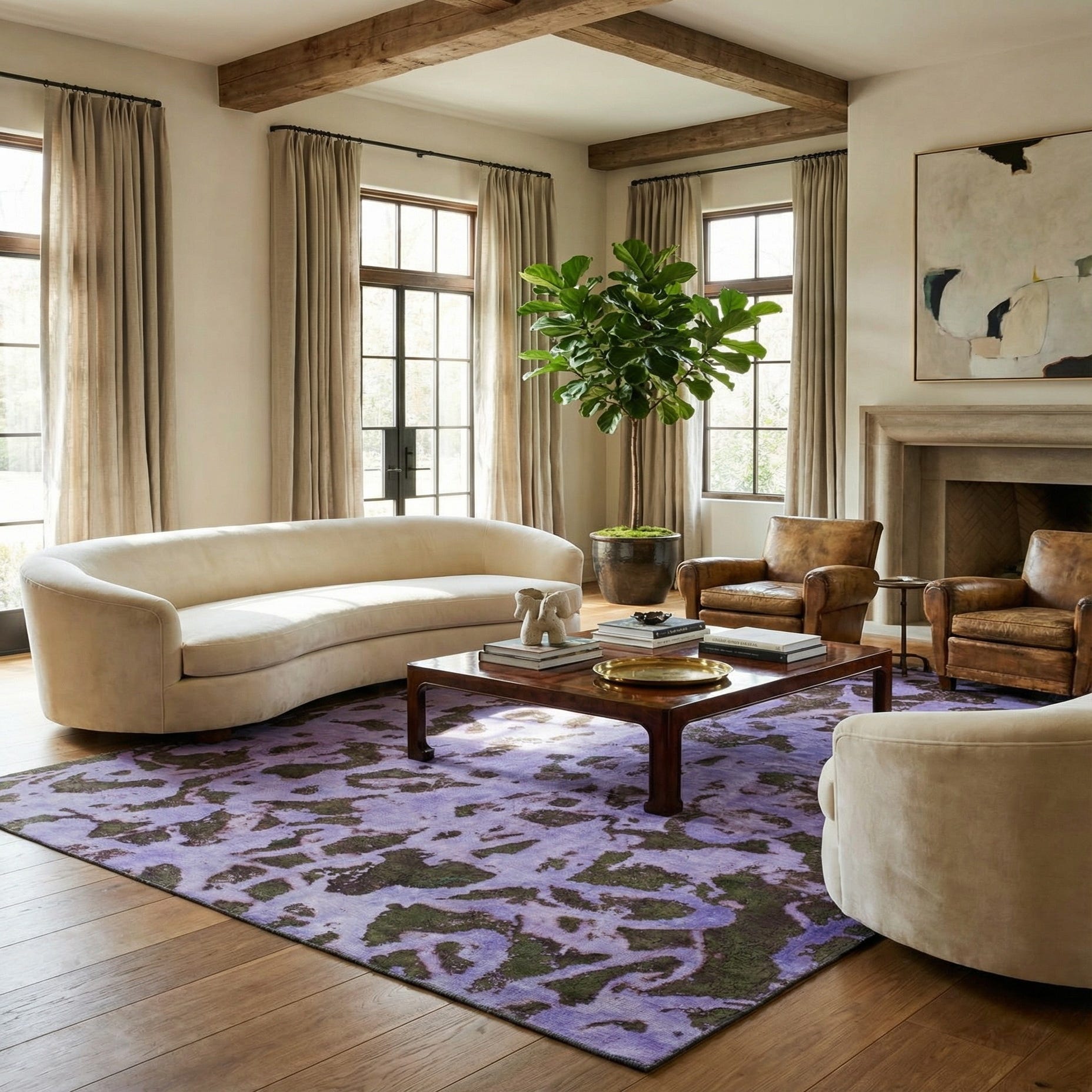 Primary color is Violet. Colors in this rug include: Violet, Brown, Olive, Green, Purple.