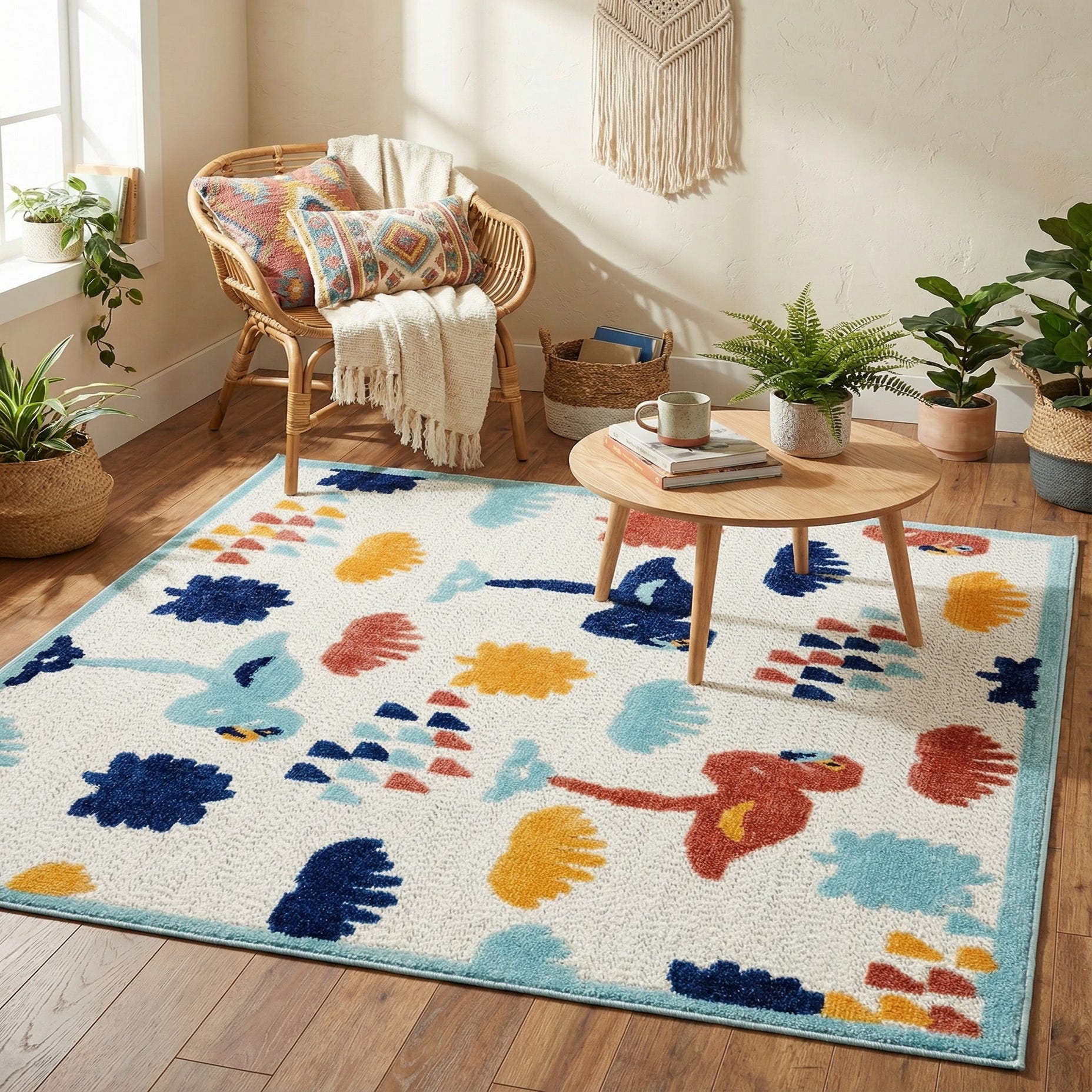 Primary color is White. Colors in this rug include: White, Gray, Light Blue, Navy Blue, Orange, Pink.