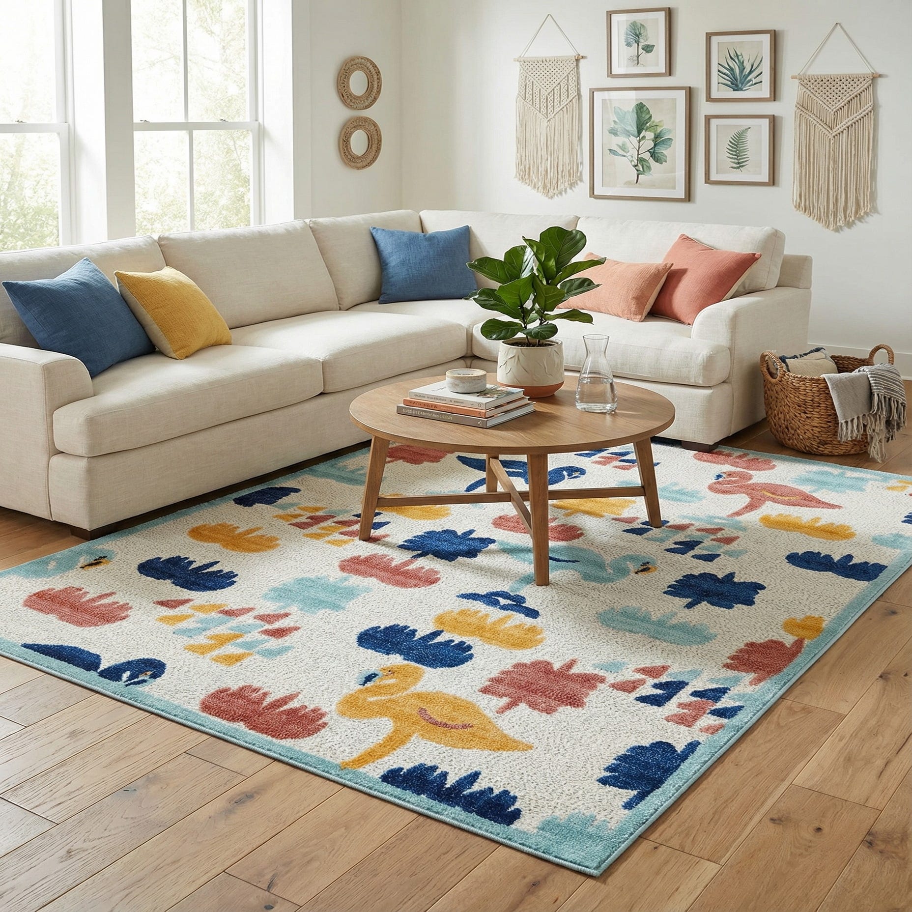 Primary color is White. Colors in this rug include: White, Gray, Light Blue, Orange, Navy Blue, Pink.
