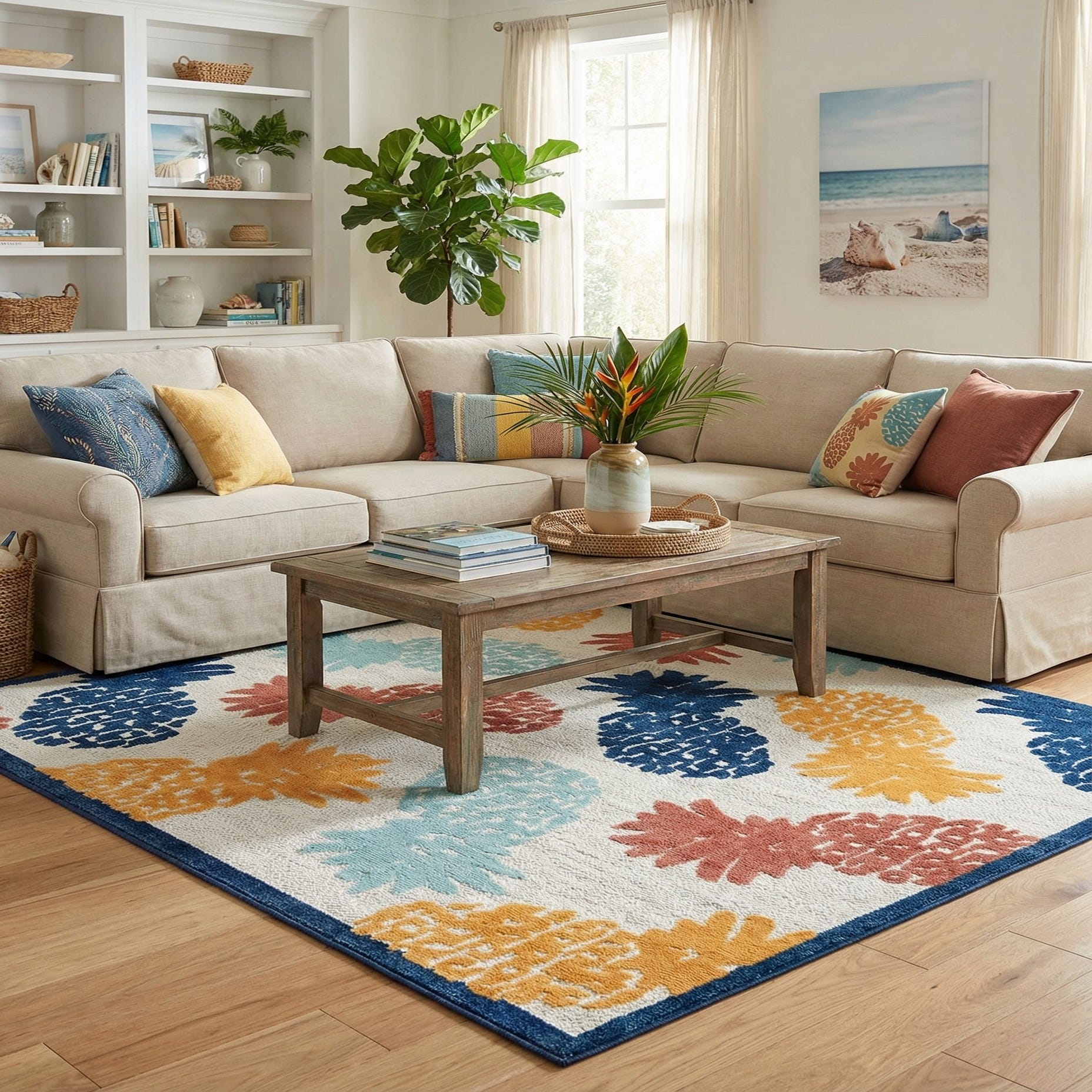 Primary color is White. Colors in this rug include: White, Light Blue, Navy Blue, Yellow, Pink.