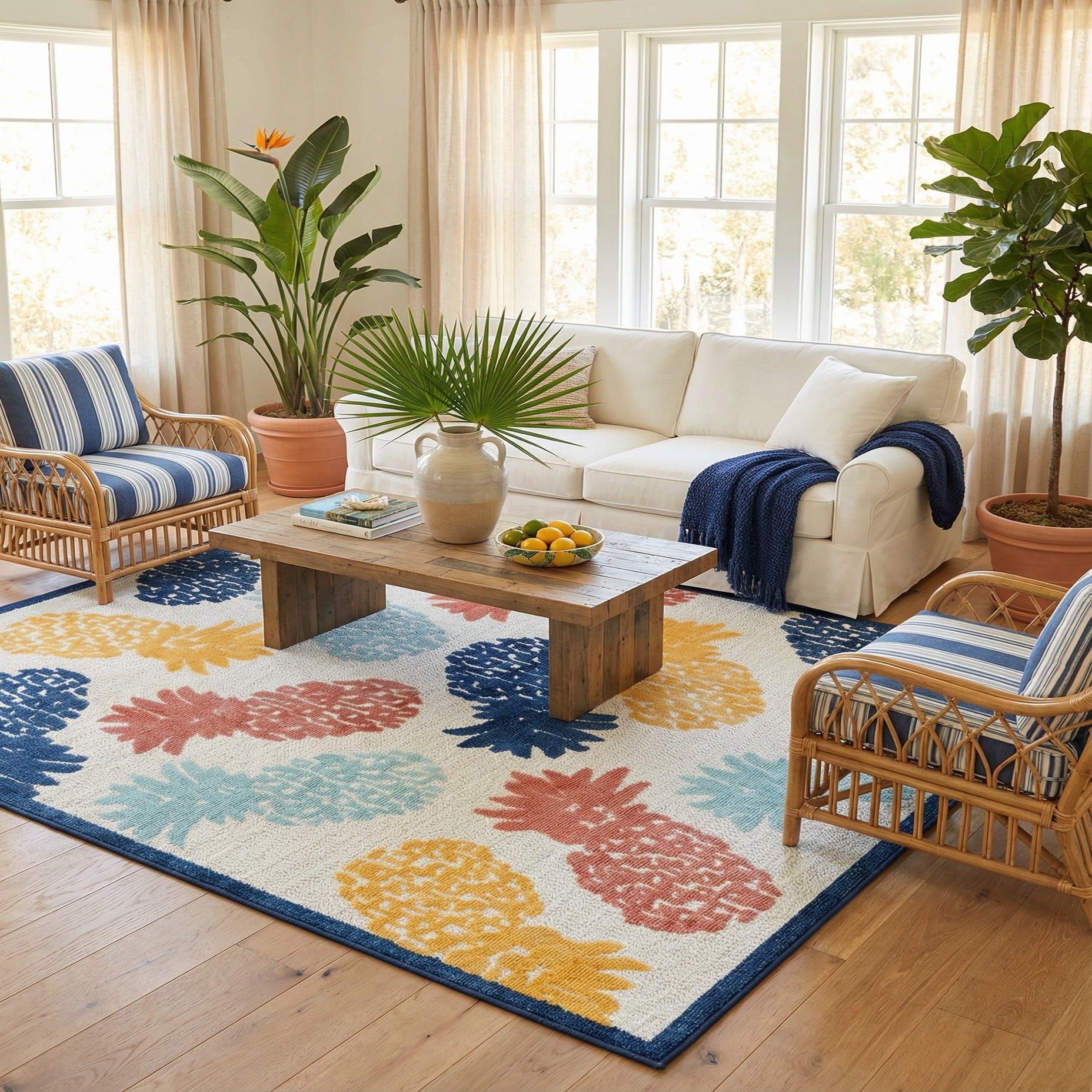 Primary color is White. Colors in this rug include: White, Light Blue, Navy Blue, Yellow, Pink.