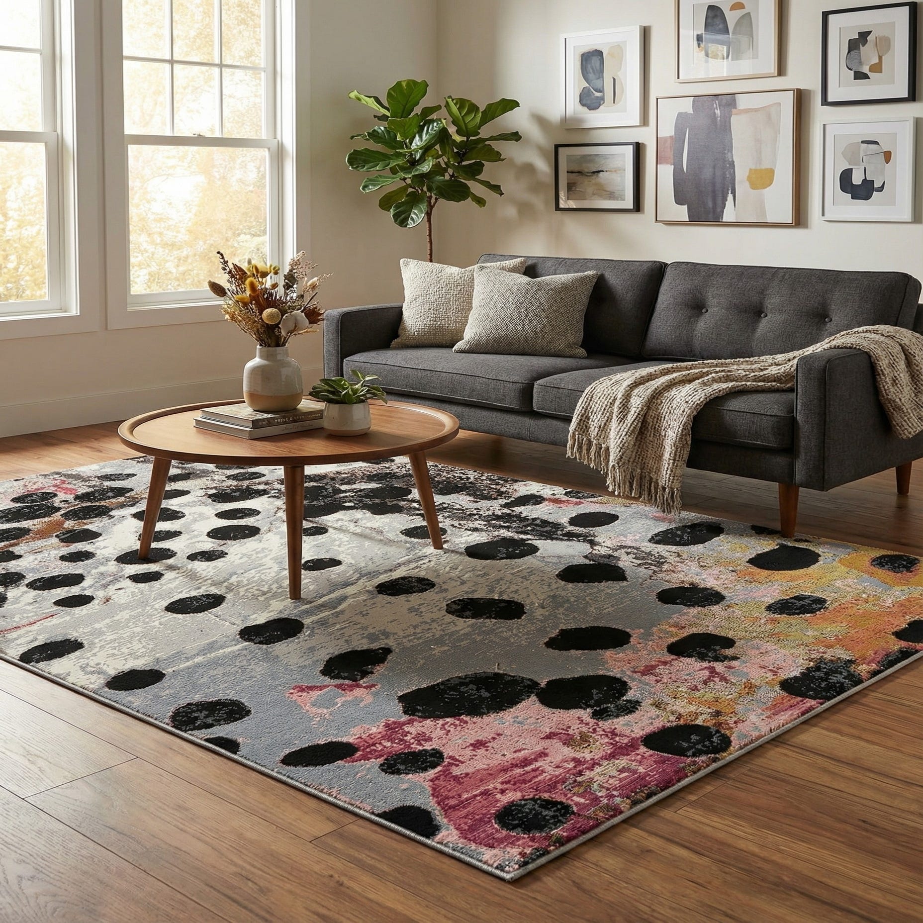 Primary color is White and Black. Colors in this rug include: White and Black, Gray, Olive, Orange, Yellow, Pink, Red.