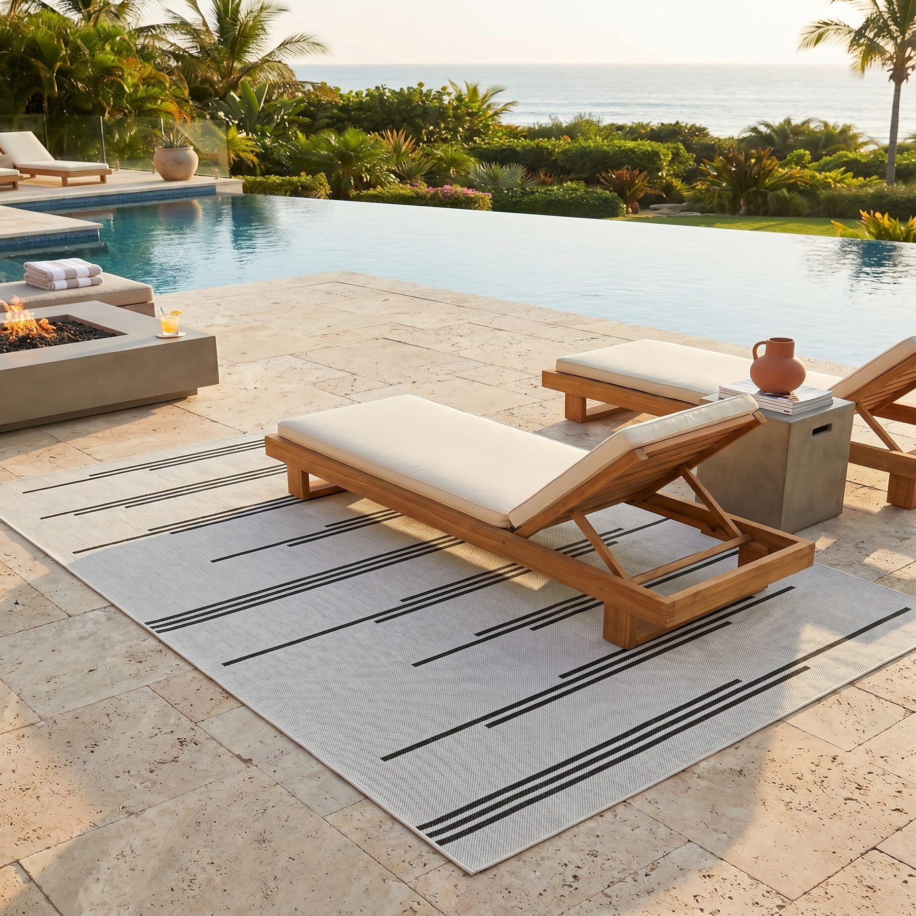 Love the contemporary look of this rug! We are so happy we chose this to accent the blue of our pool with our living area on our lanai. We still are going to add a few more pillows but love the rug to add color.