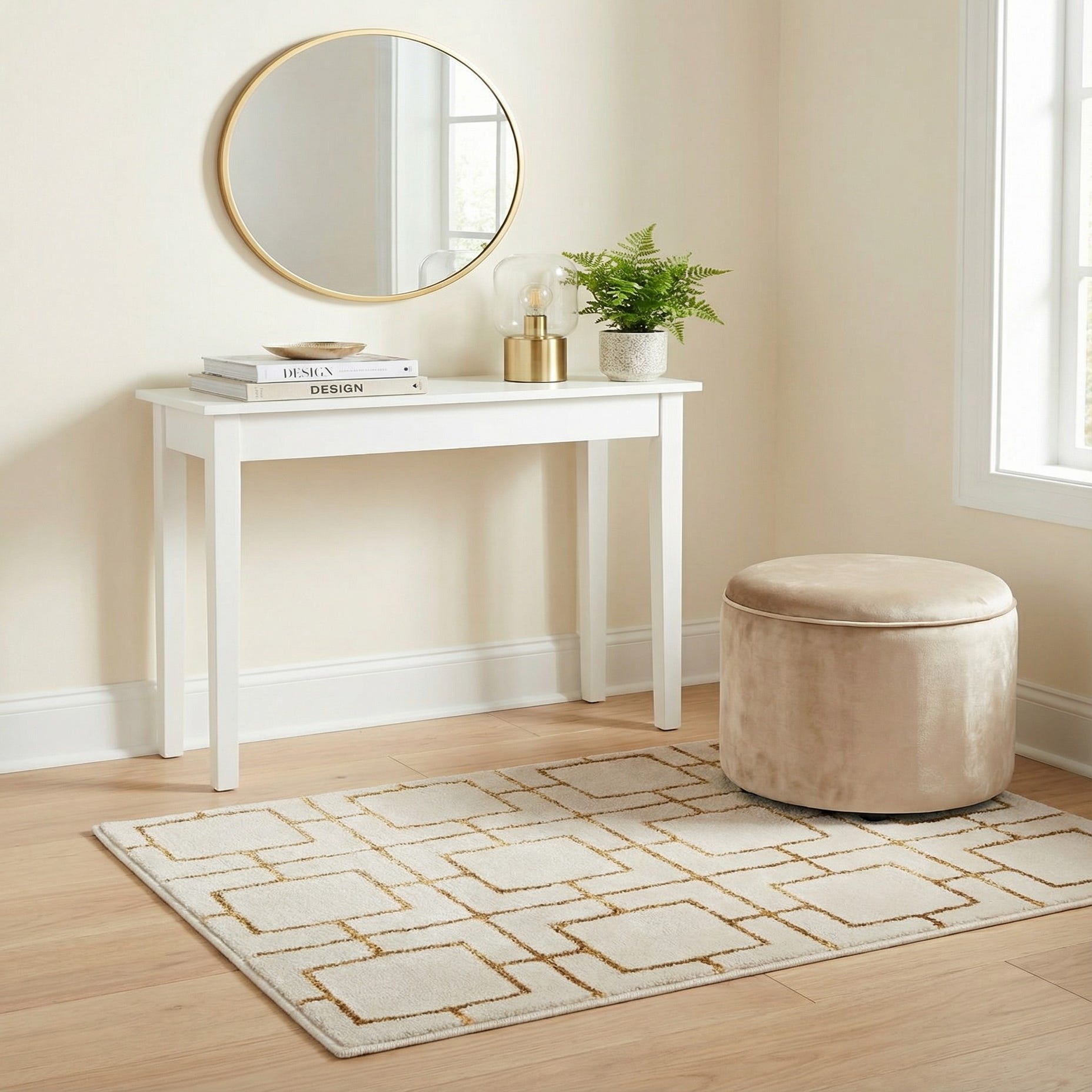 Primary color is White Gold. Colors in this rug include: White Gold, Gold.