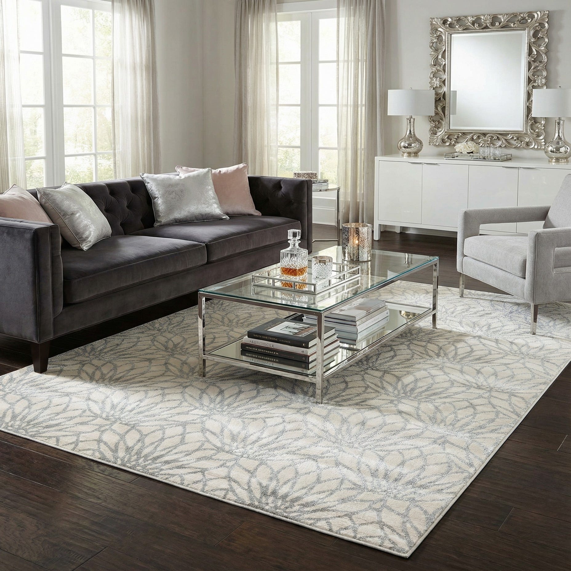 Primary color is White Silver. Colors in this rug include: White Silver, Silver.