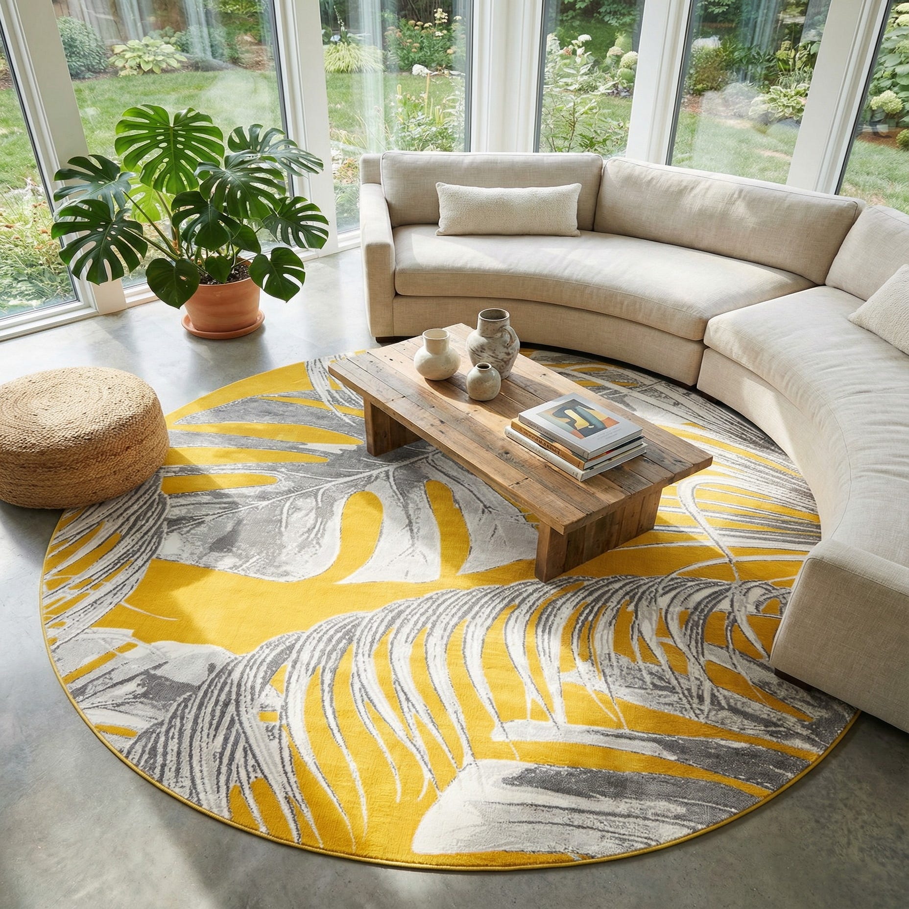 Primary color is Yellow. Colors in this rug include: Yellow, Ivory, Gray.