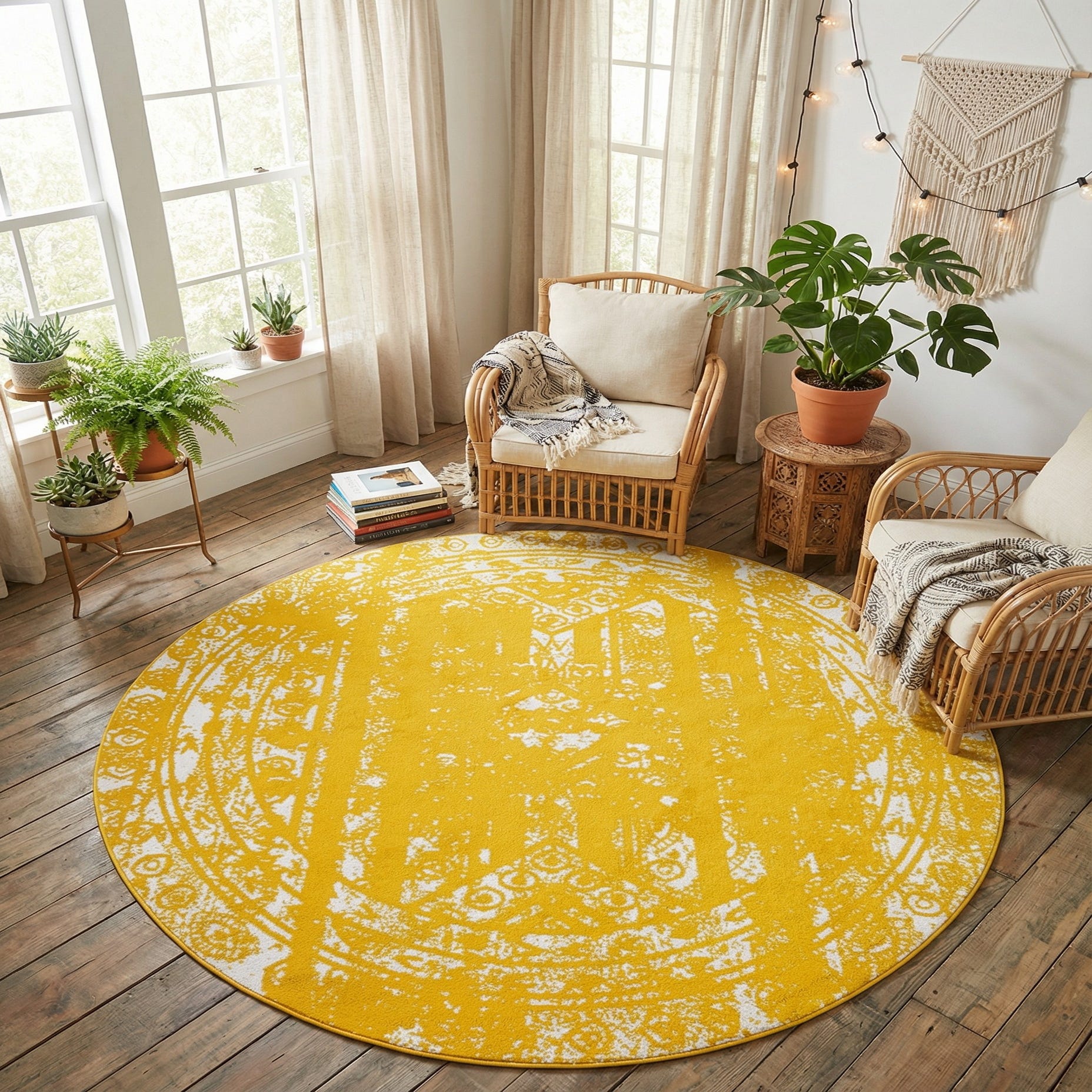 Primary color is Yellow. Colors in this rug include: Yellow, Ivory.
