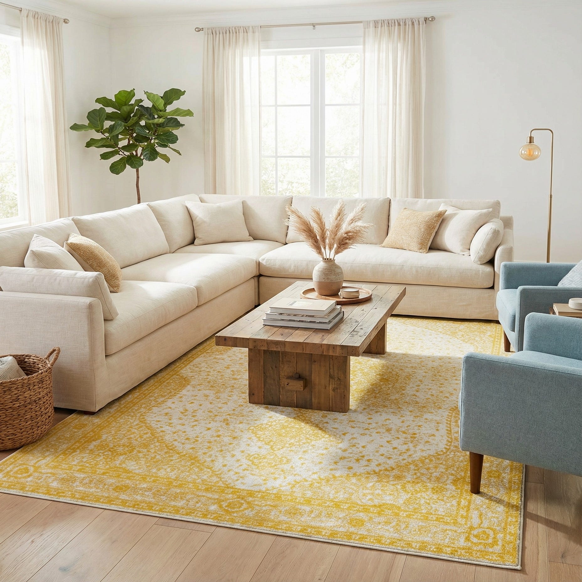 Primary color is Yellow. Colors in this rug include: Yellow, Ivory.