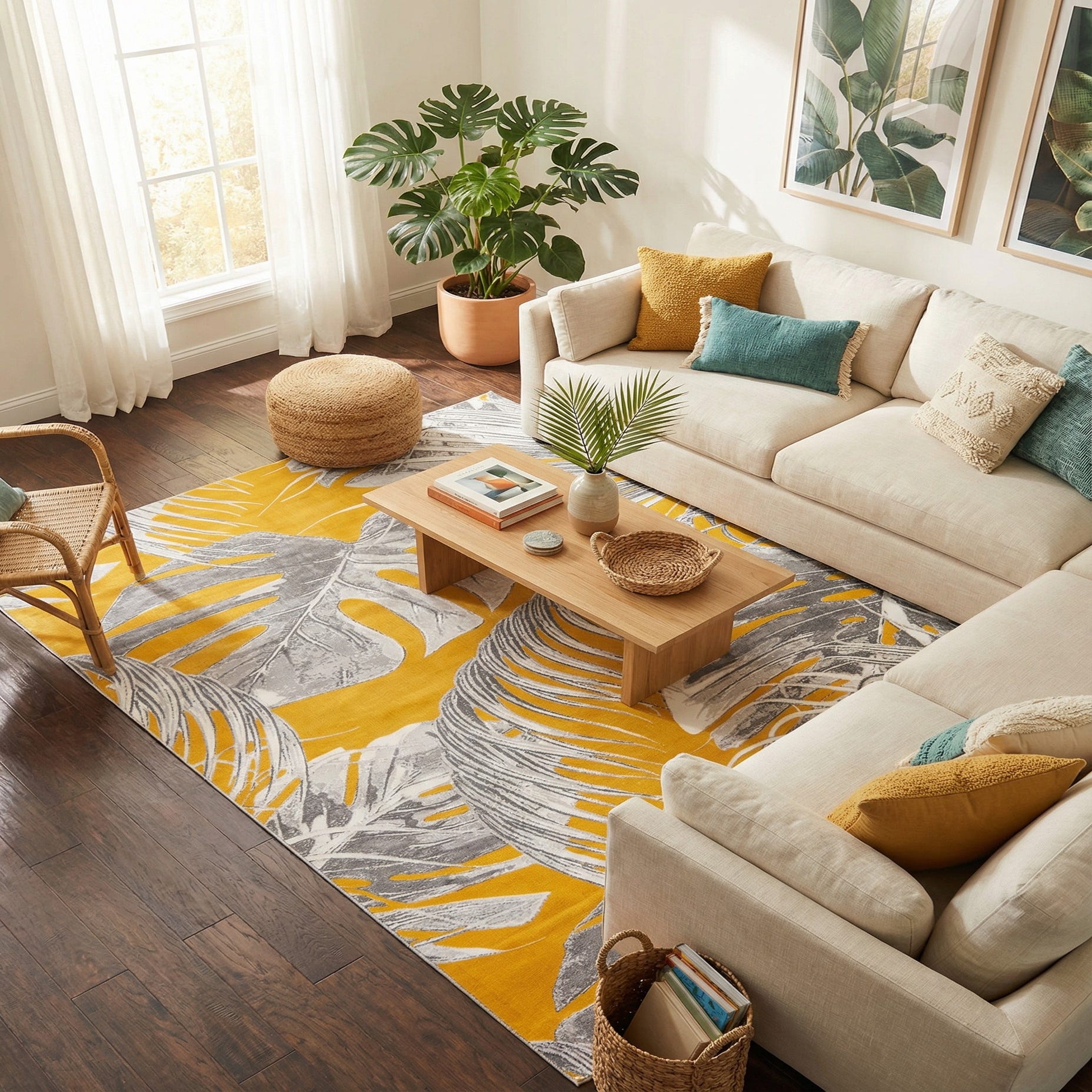 Primary color is Yellow. Colors in this rug include: Yellow, Ivory, Gray.