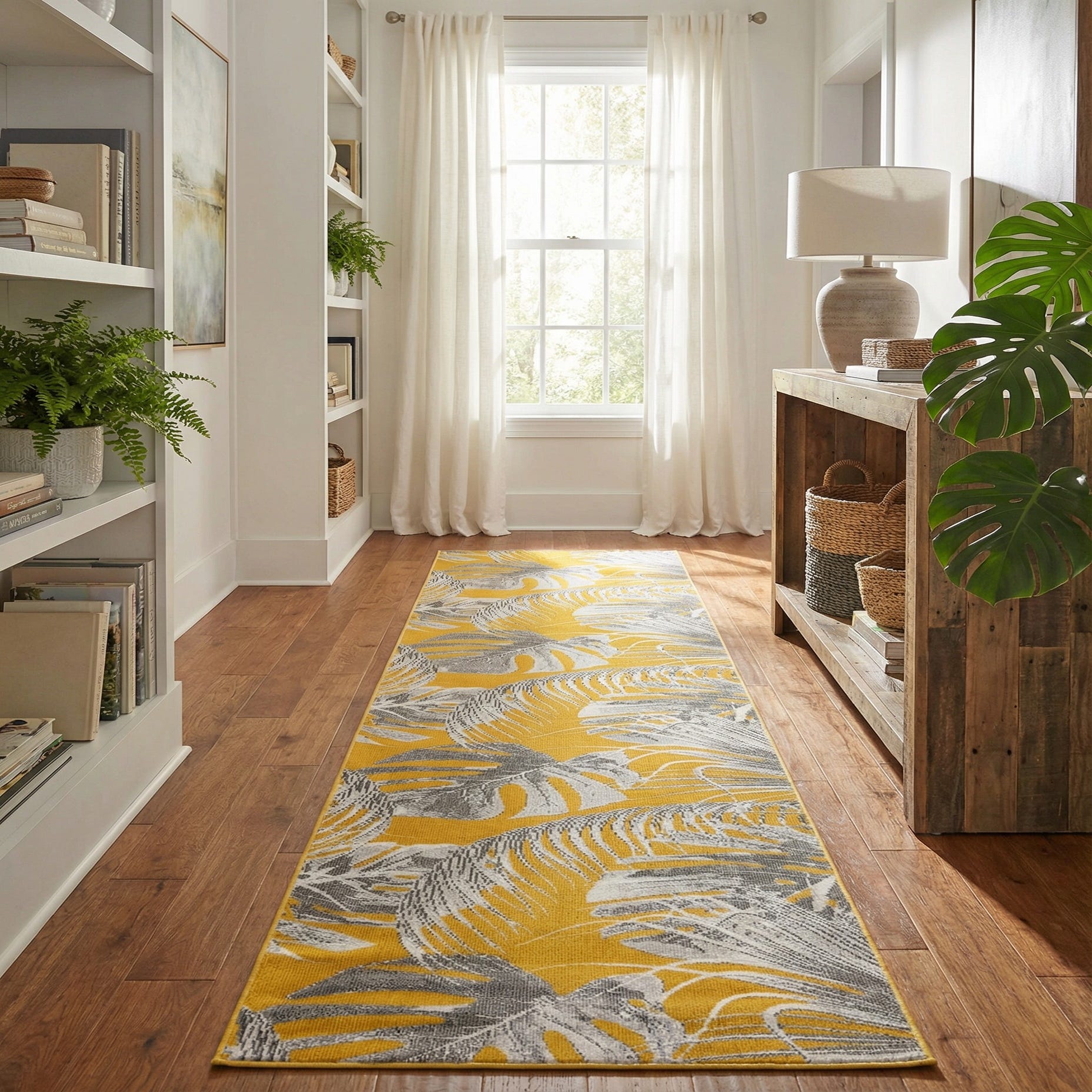 Primary color is Yellow. Colors in this rug include: Yellow, Ivory, Gray.
