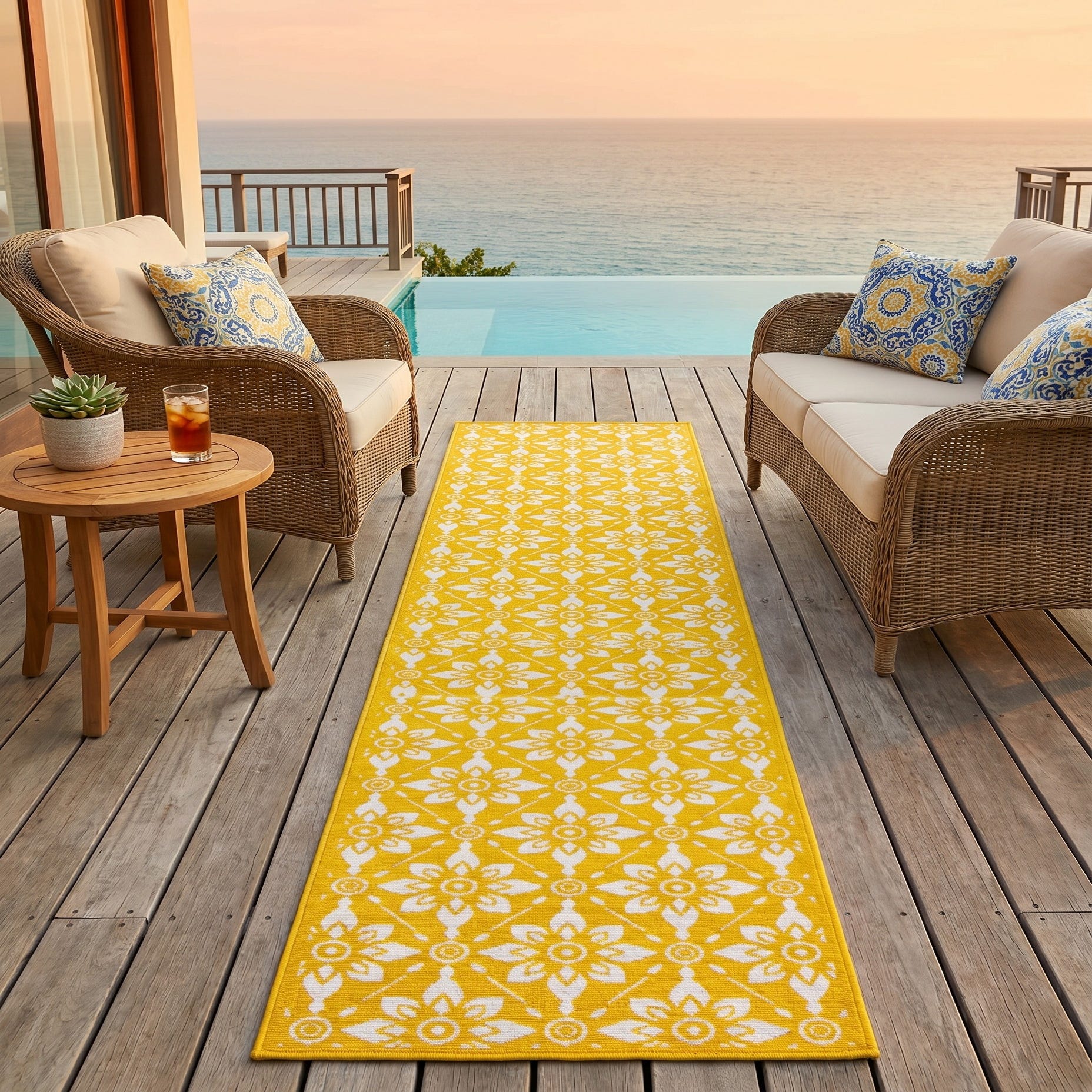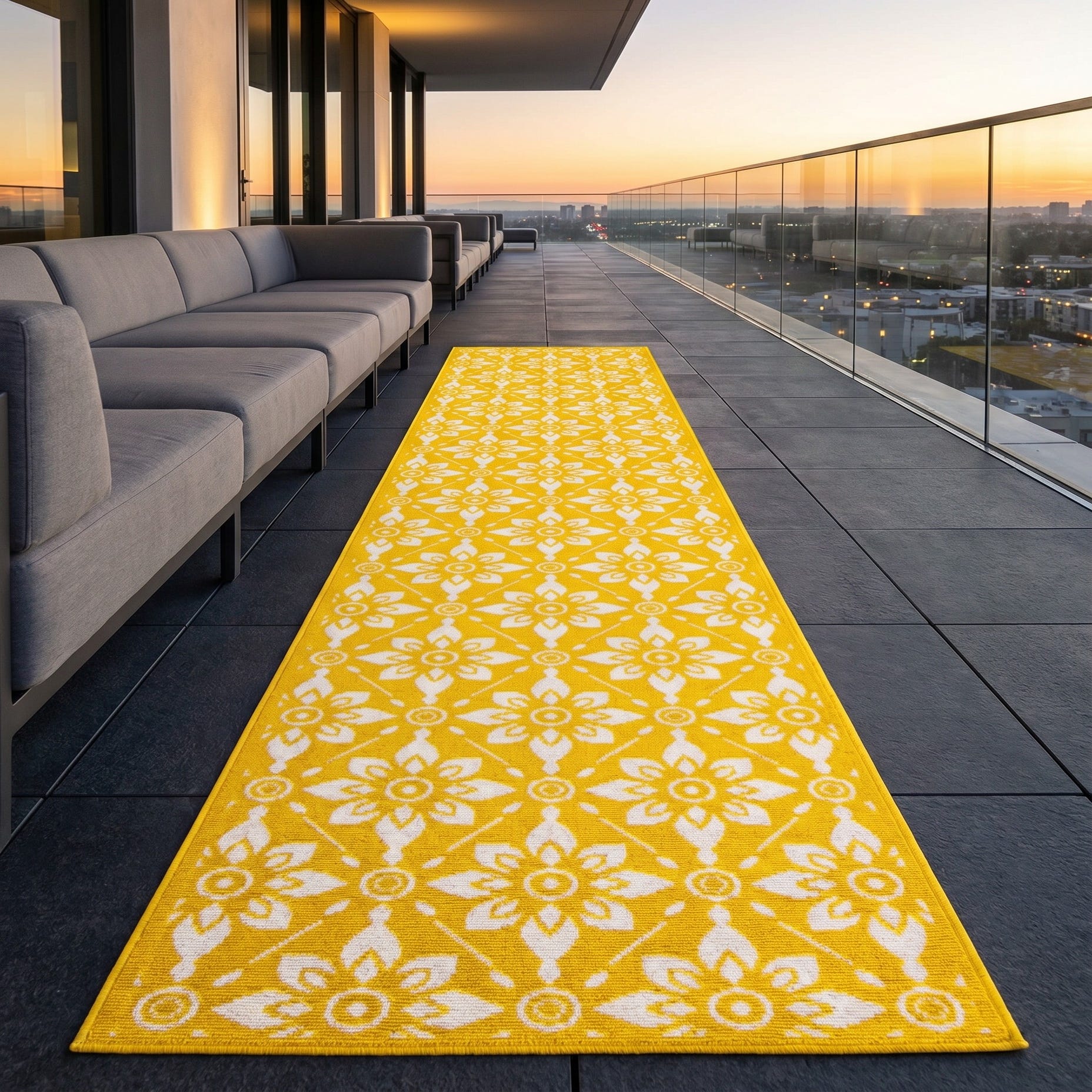 BRIGHT and SUNSHIN-Y !! Our cushions are dark green and YELLOW stripes; our table's Umbrella is bright YELLOW; and this RUG ENHANCE THEM ALL!As expected; it is taking several days for the folds to relent....the rug has after all been rolled tightly for many weeks. In MAINE where we live SPRING AND SUMMER are hugely beloved after long and cold and snowy and icy winters! This is SUNSHINE on the floor!