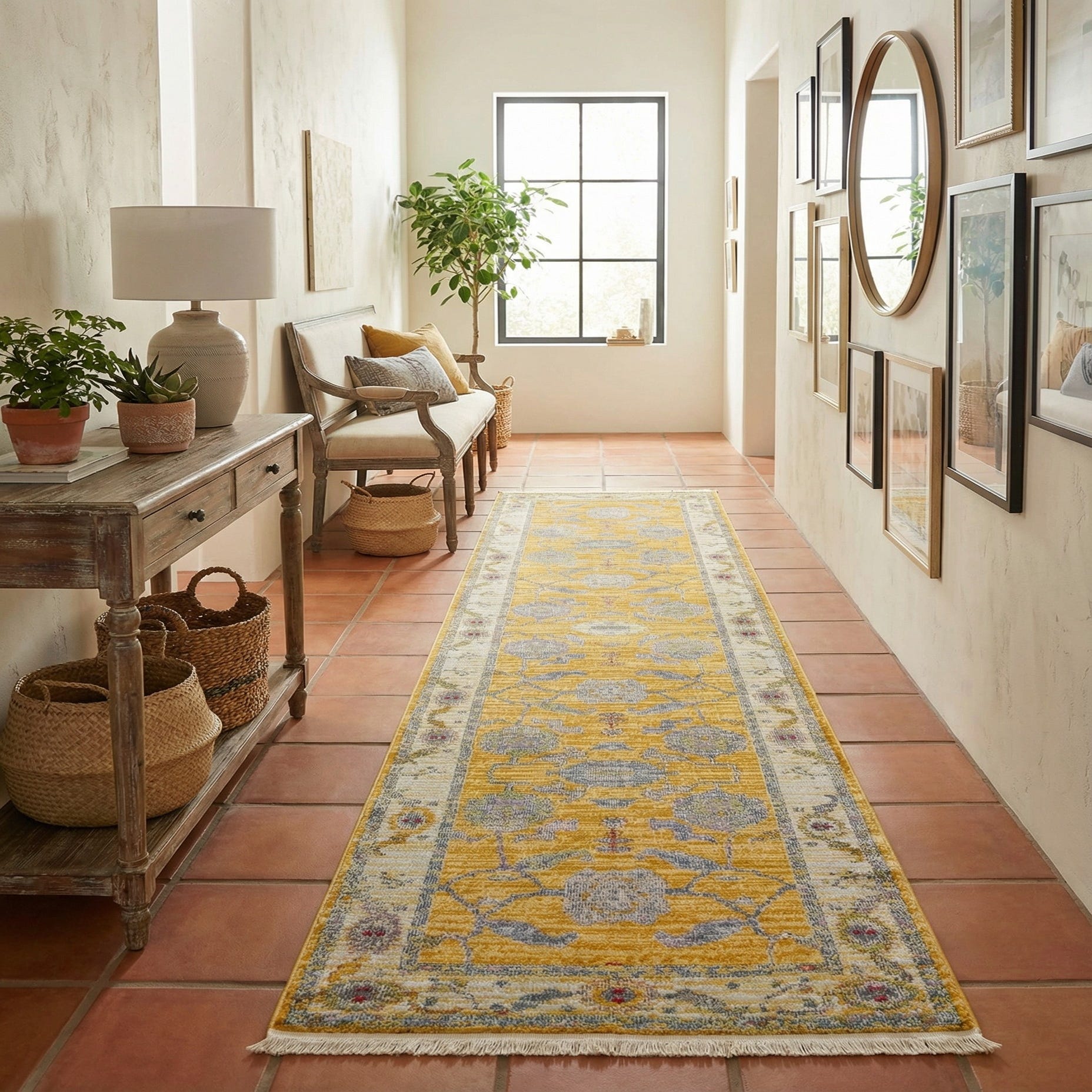 Primary color is Yellow. Colors in this rug include: Yellow, Blue, Gray, Green, Ivory, Light Blue, Orange, Pink.
