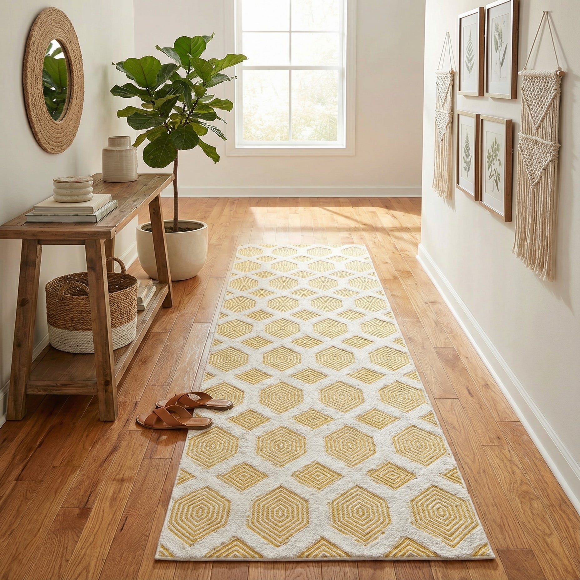 Primary color is Yellow. Colors in this rug include: Yellow, Ivory.