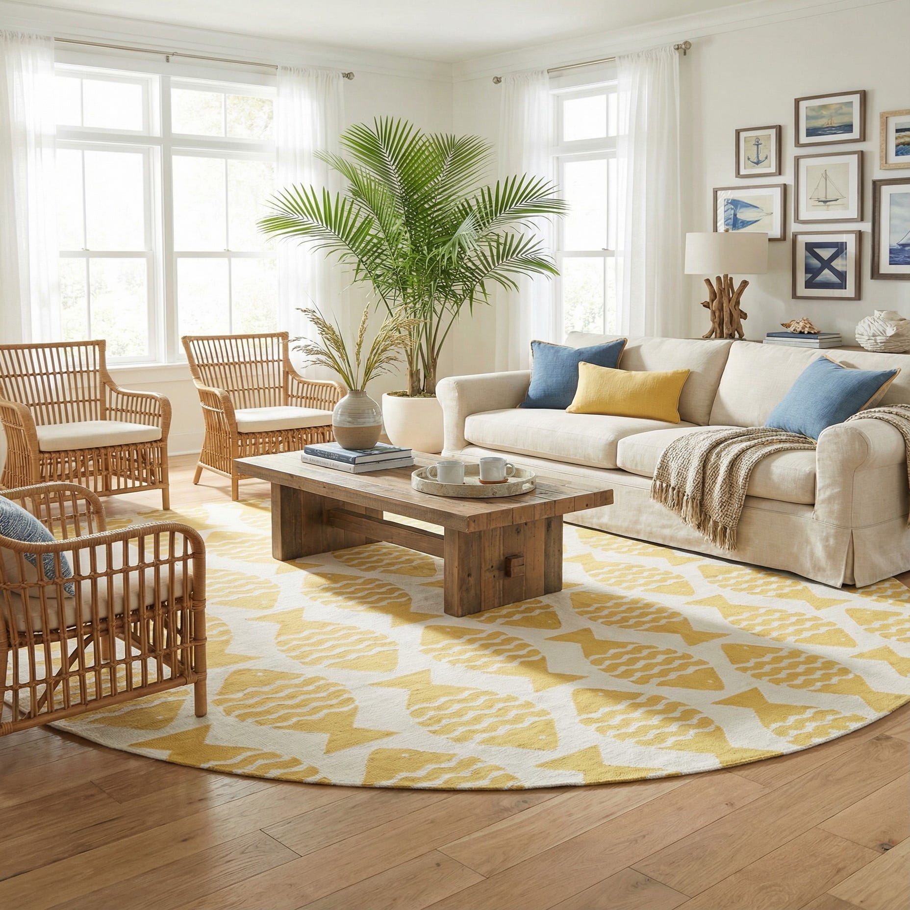 Primary color is Yellow. Colors in this rug include: Yellow, Ivory.
