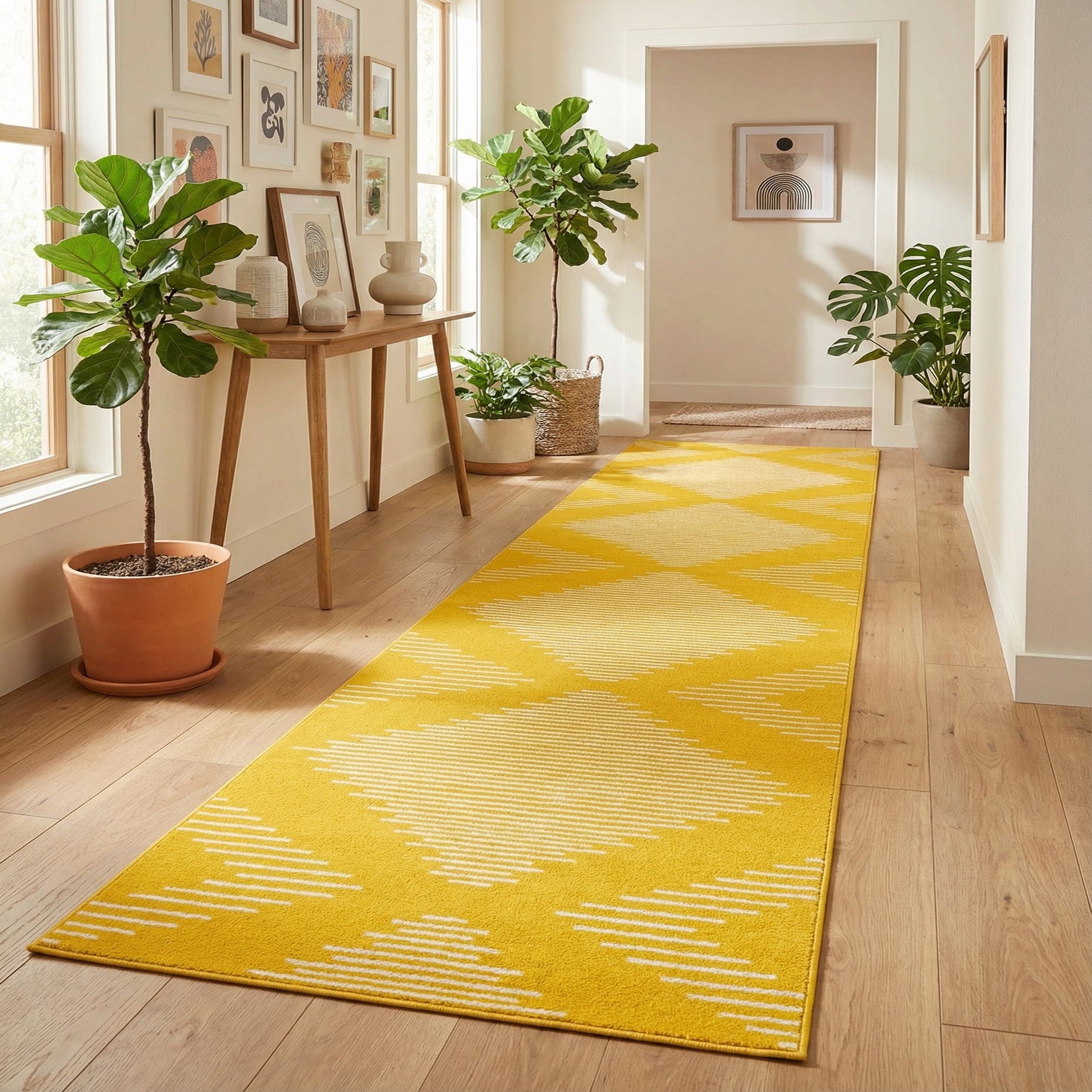 Primary color is Yellow. Colors in this rug include: Yellow, Ivory.