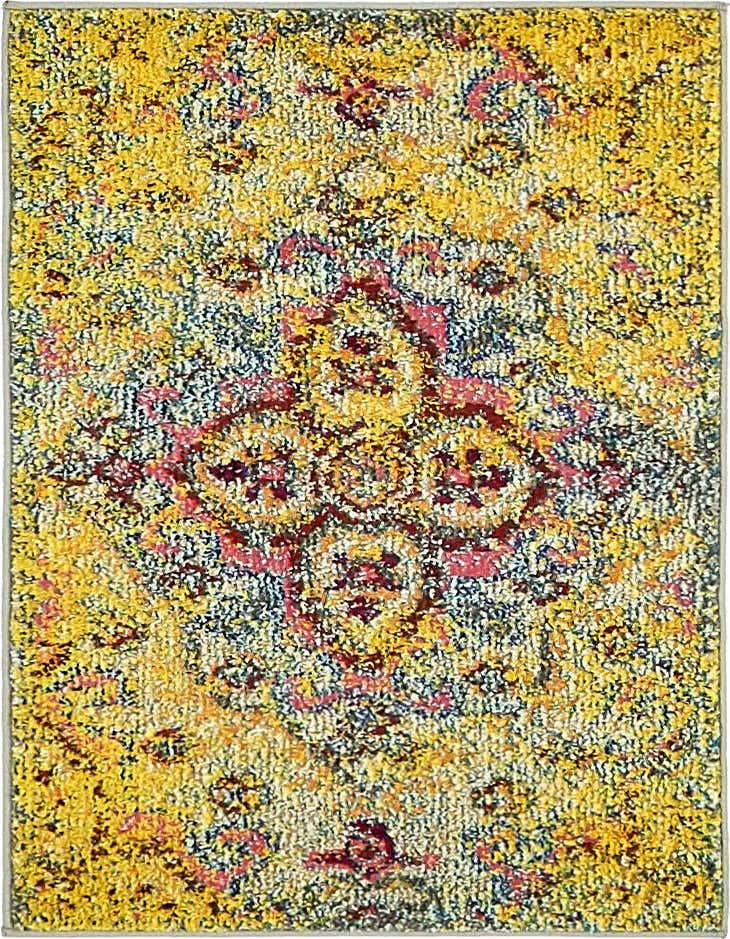 Primary color is Yellow. Colors in this rug include: Yellow, Beige, Gray, Navy Blue, Orange, Red, Pink.