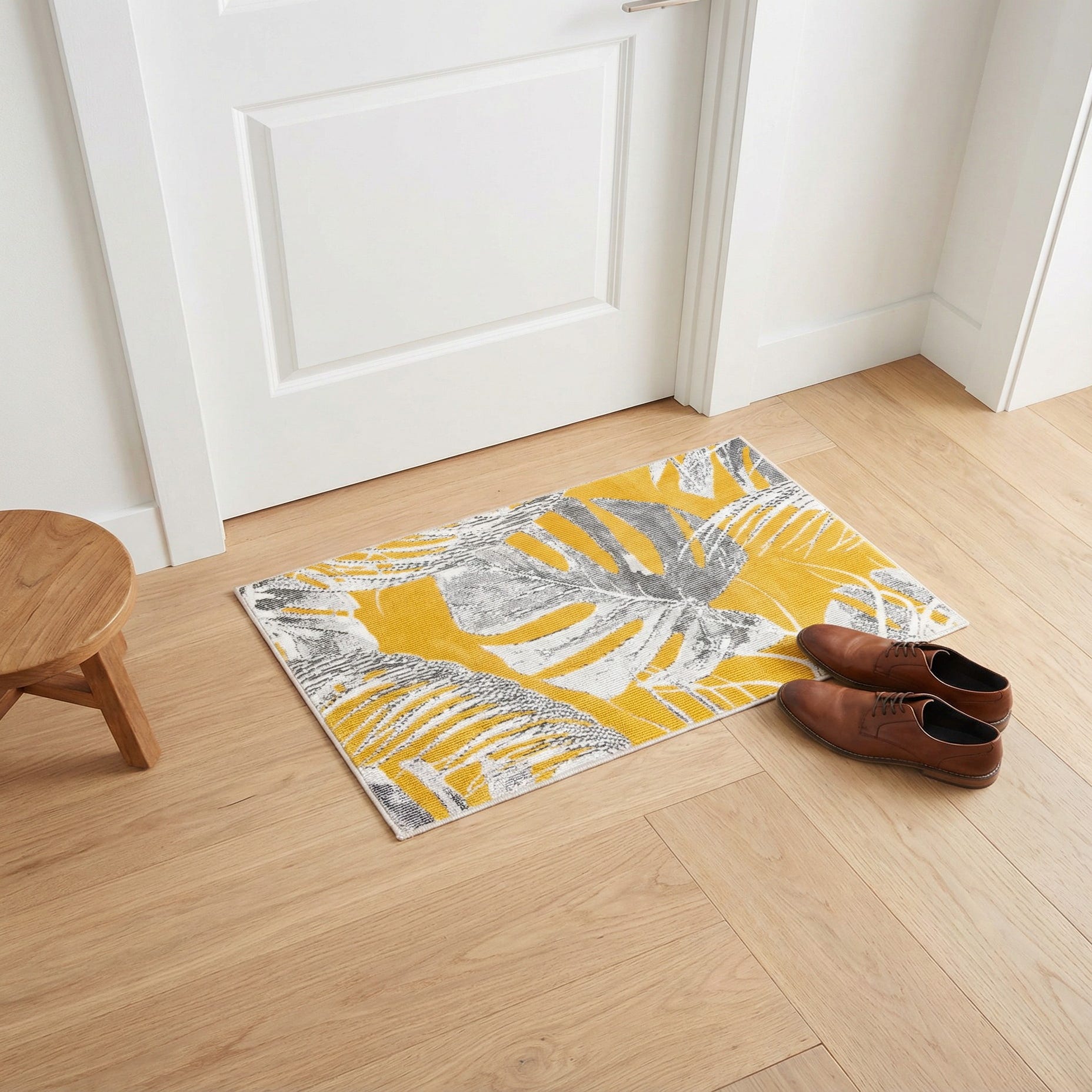 Primary color is Yellow. Colors in this rug include: Yellow, Gray, Ivory.