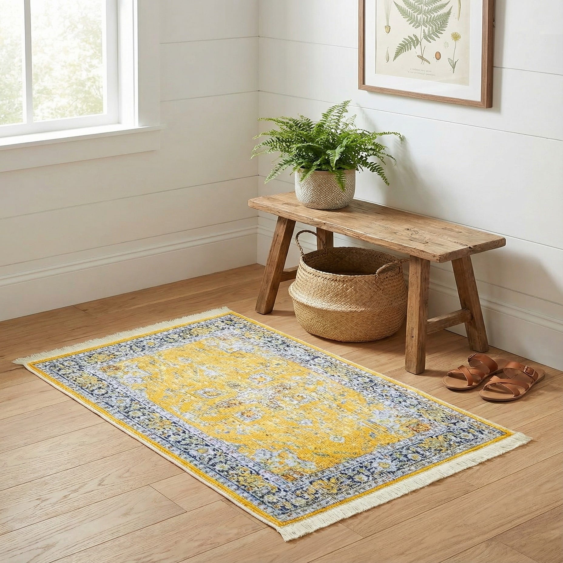 Primary color is Yellow. Colors in this rug include: Yellow, Blue, Gray, Ivory, Light Blue, Orange.