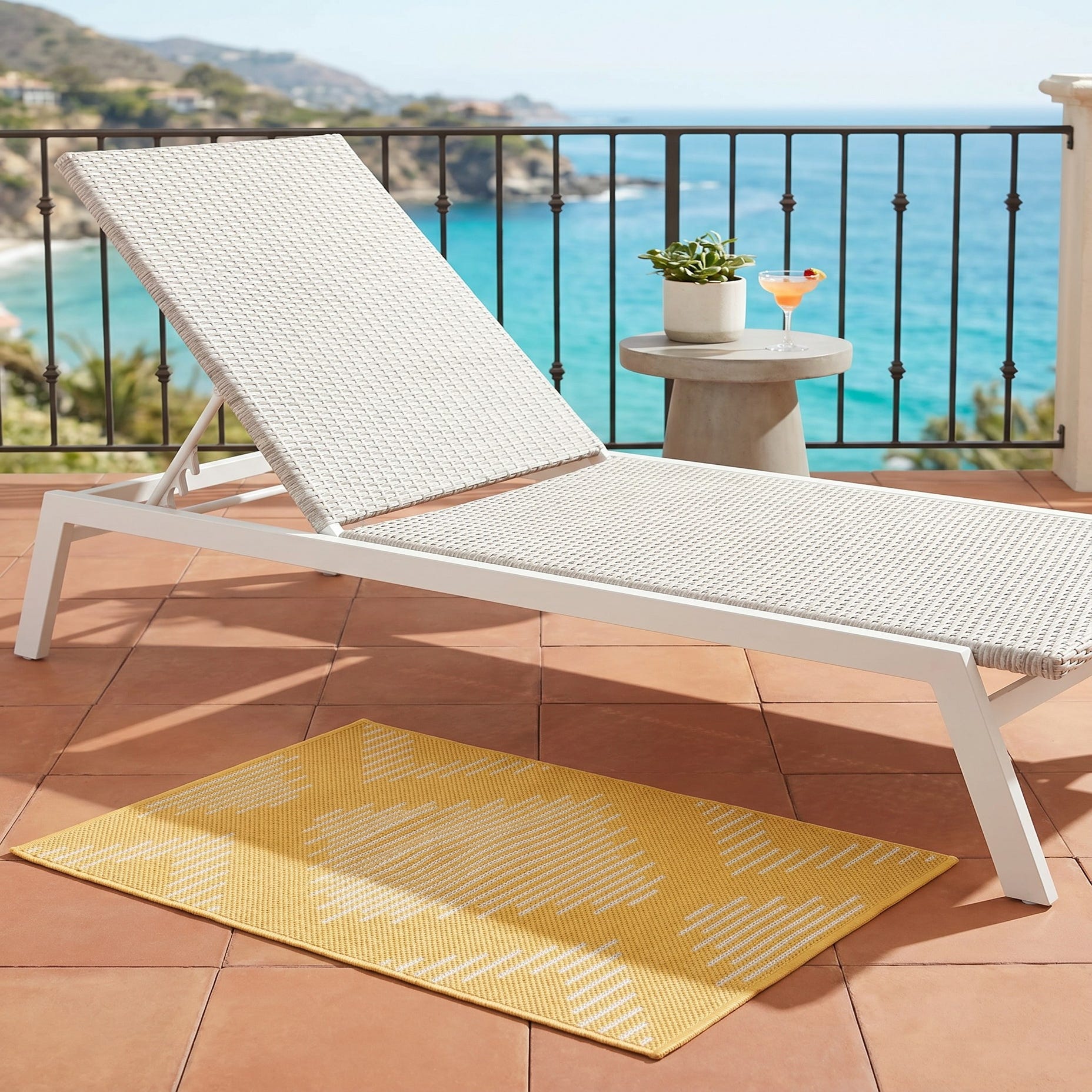 Love the contemporary look of this rug! We are so happy we chose this to accent the blue of our pool with our living area on our lanai. We still are going to add a few more pillows but love the rug to add color.