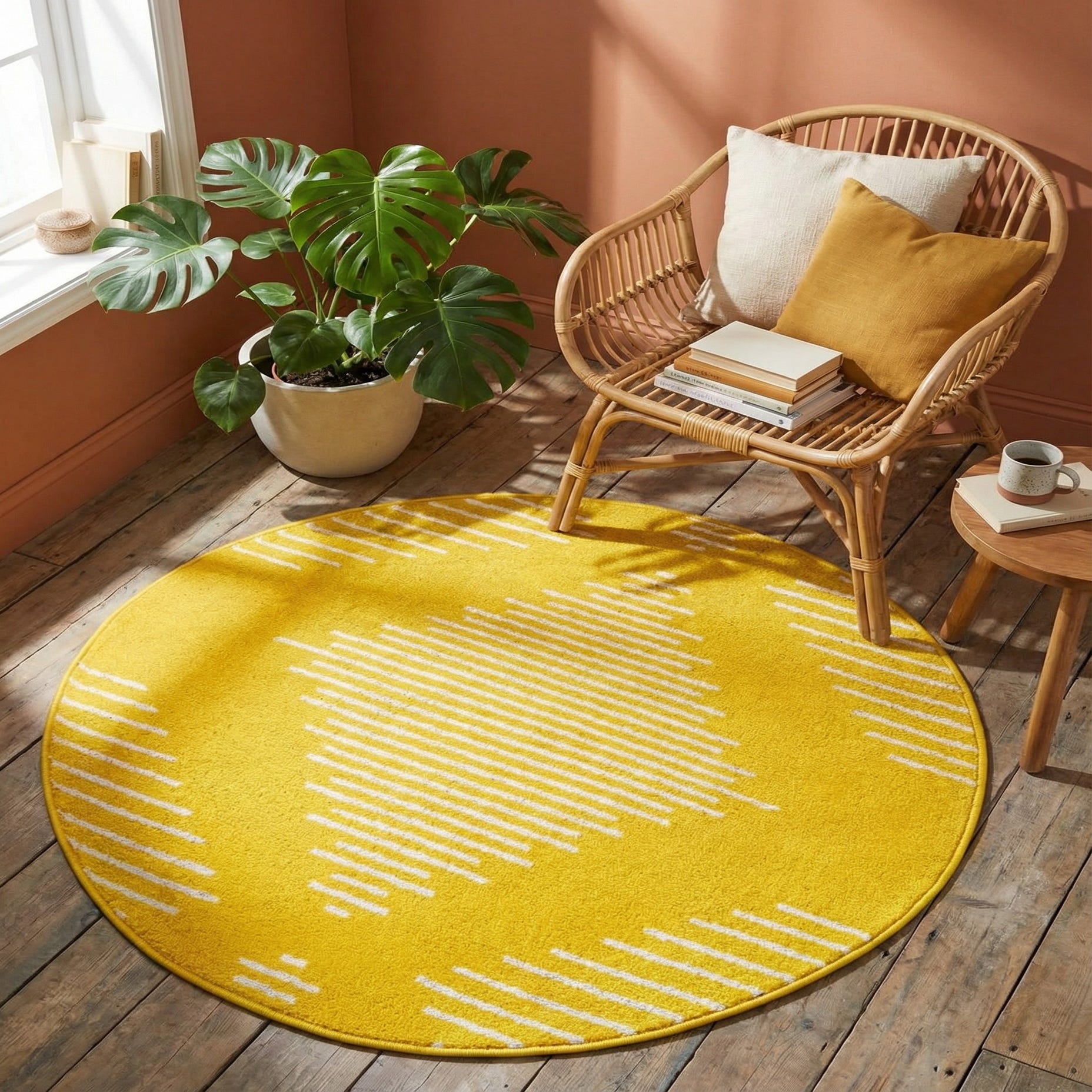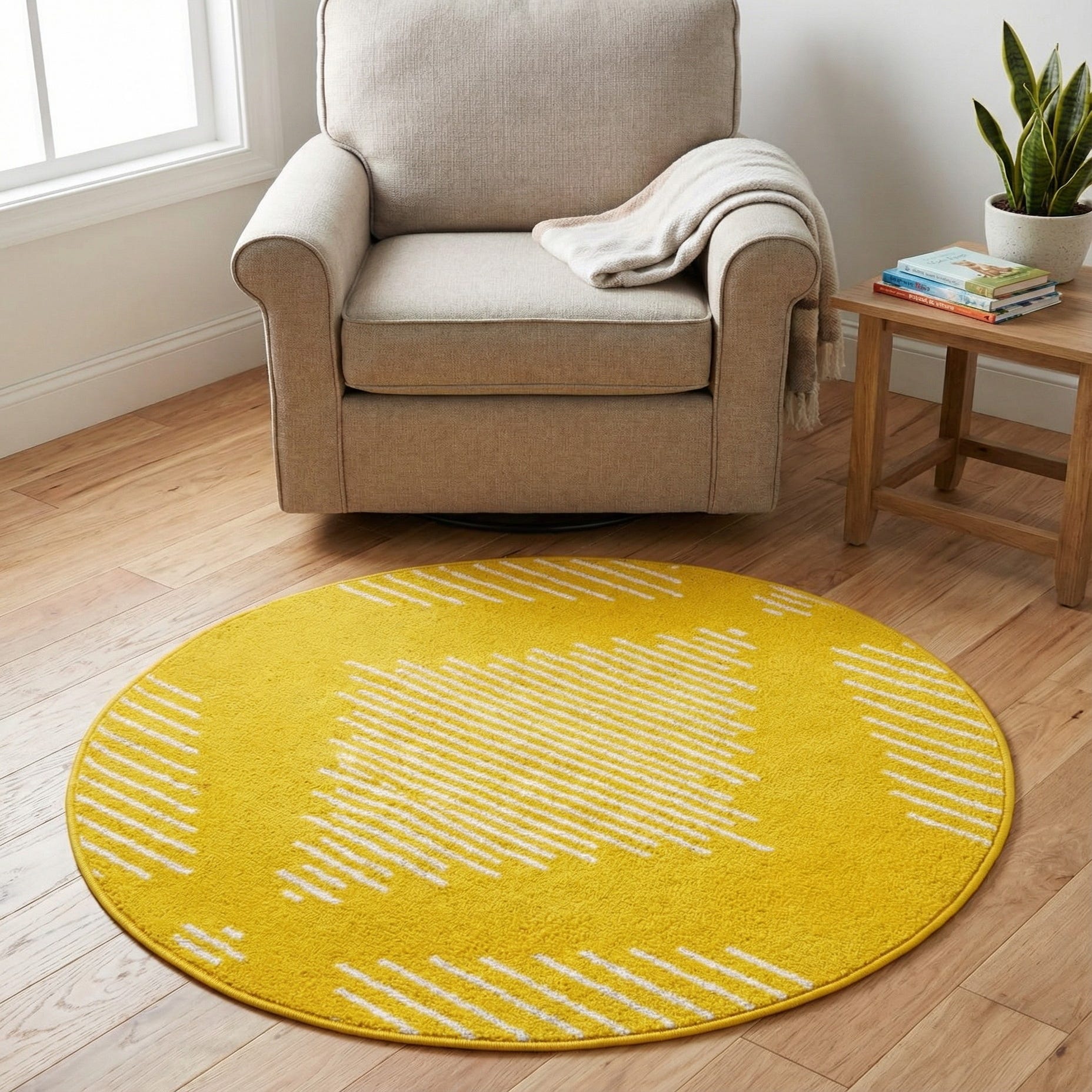 Primary color is Yellow. Colors in this rug include: Yellow, Ivory.