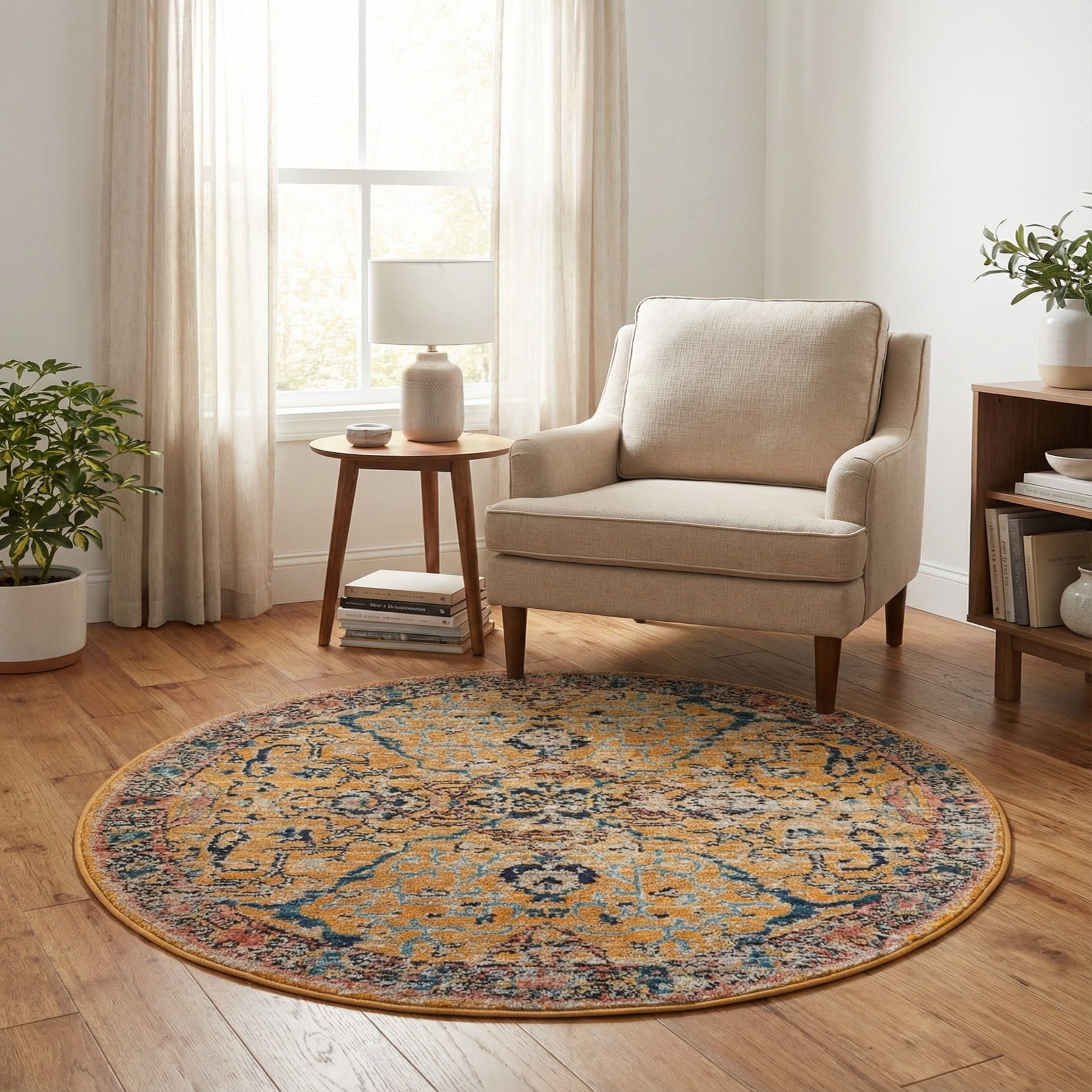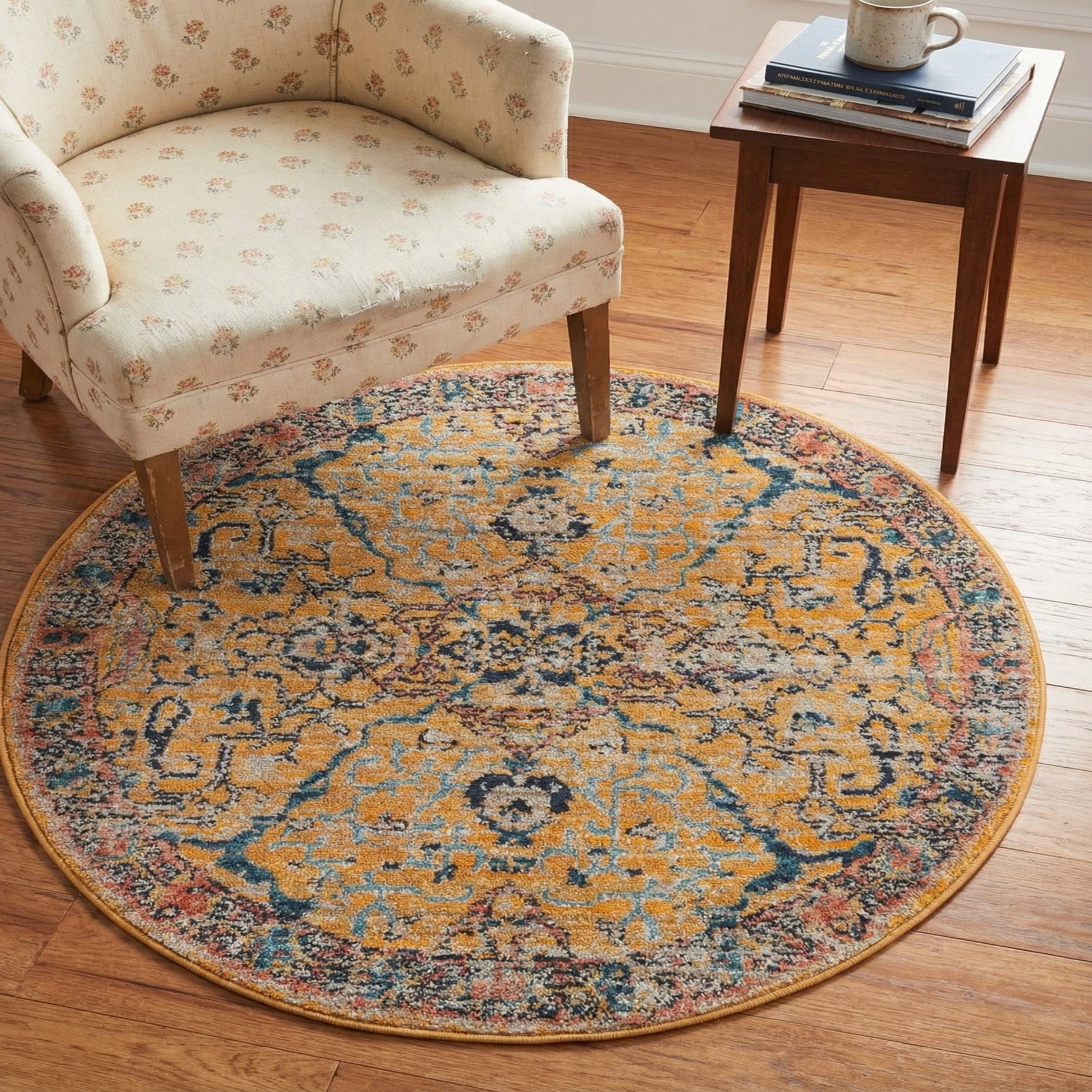 Primary color is Yellow. Colors in this rug include: Yellow, Blue, Light Blue, Rust Red.