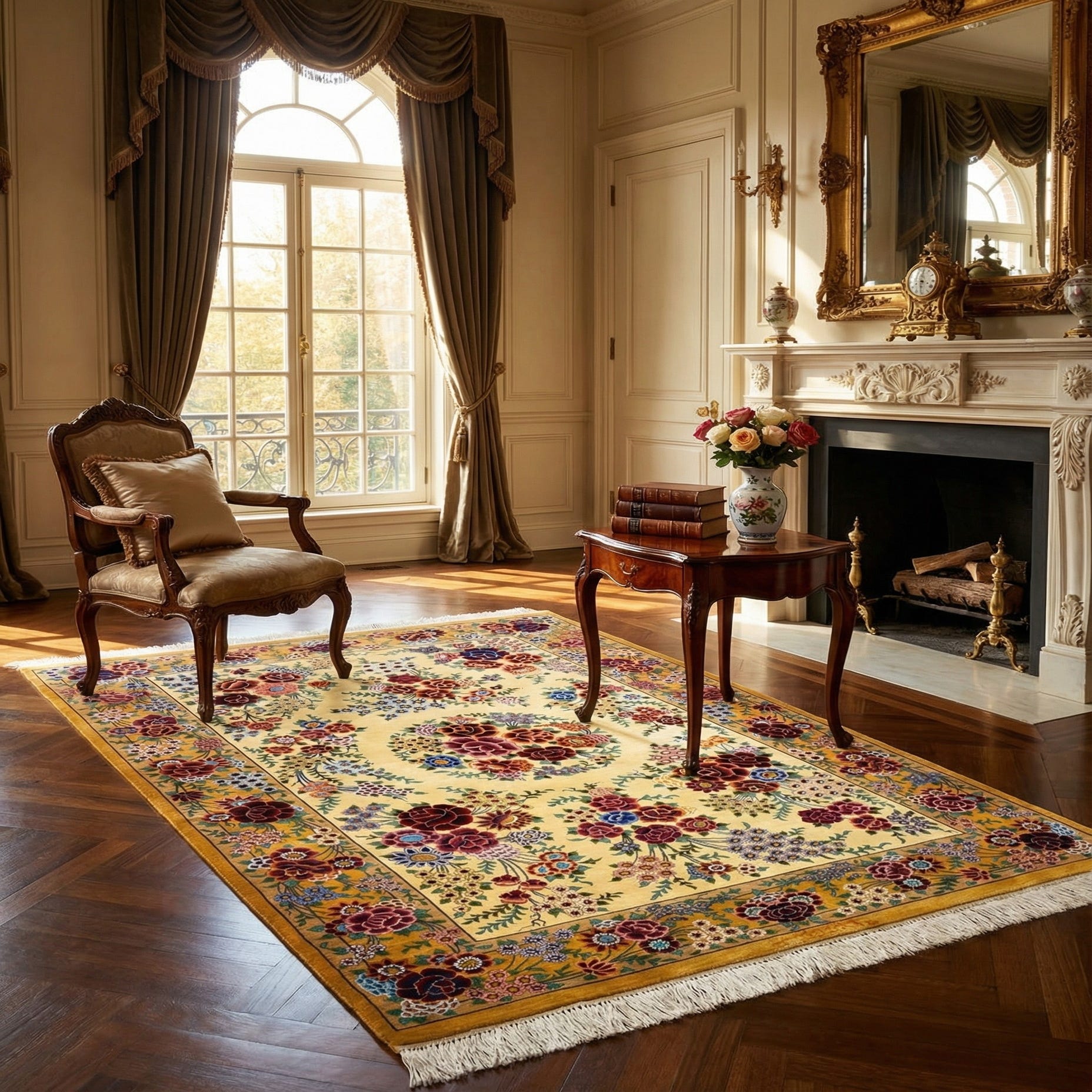 Primary color is Yellow. Colors in this rug include: Yellow, Yellow, Orange, Green, red, Cream, Blue, Pink.