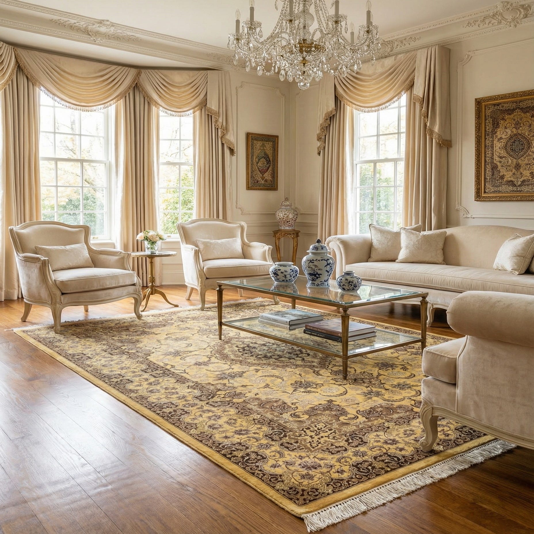 Primary color is Yellow. Colors in this rug include: Yellow, Yellow, Brown, Beige, Light Blue, Green, Olive.