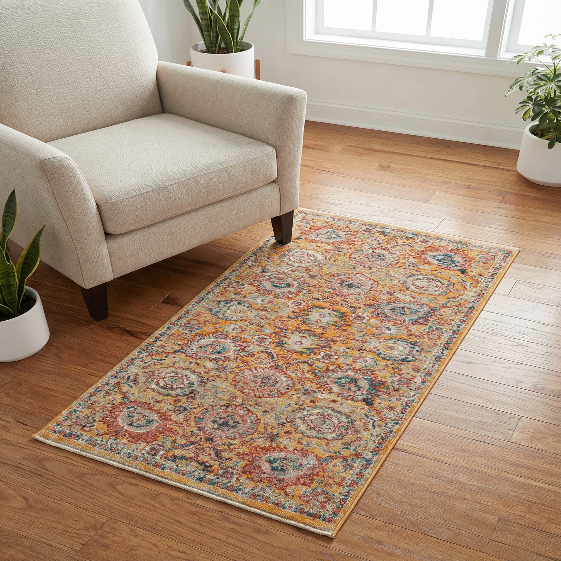 Primary color is Yellow. Colors in this rug include: Yellow, Ivory, Light Blue, Rust Red, Pink.